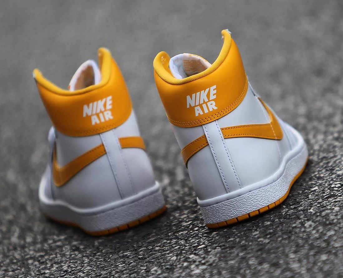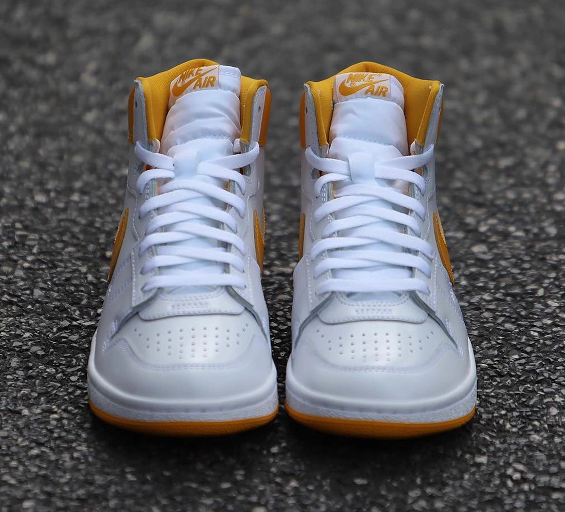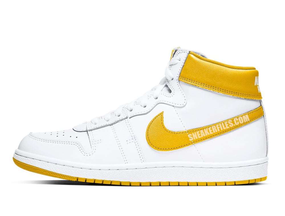 This Nike Air Ship comes dressed in a White and University Gold color combination. Utilizing a clean theme, White leather appears on the upper while University Gold fills in the Swoosh, ankle, tongue branding, liner, and the rubber outsole. Other details include White on the tongue, laces, โNike Airโ branding, and midsole.