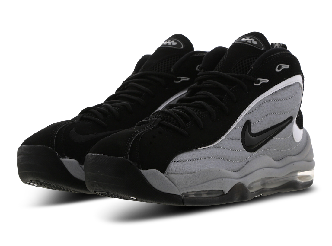 This Nike Air Total Max Uptempo features a Metallic Silver, Black, and White color combination. First, it features Black nubuck across the uppers while White adorns the trimming. Next, we have Grey tumbled leather on the panels, which also extends around the heel and mesh on the collars. Black appears on the jewel Swoosh logos, Grey runs across the midsole, and we have a translucent Air Max unit. Finally, a Black rubber outsole finishes the look.