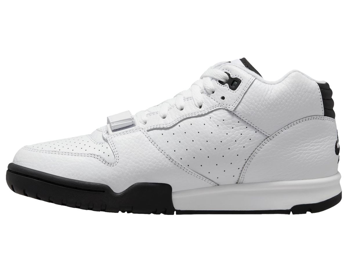 This Nike Air Trainer 1 features White leather on the upper, along with perforations and mesh on the tongues. Next, Black adorns the Swoosh logos, Nike branding, top eyelets, and the outsole. Finishing the look is a White midsole.