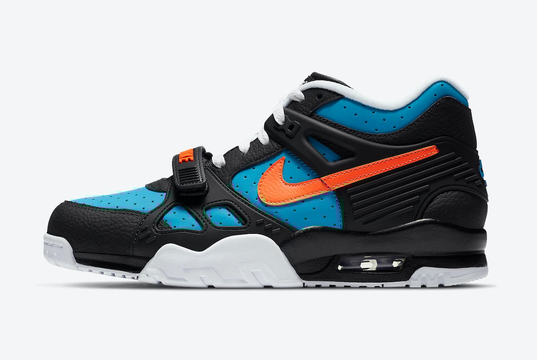 This Nike Air Trainer 3 comes dressed in a Black, Total Orange and Laser Blue color combination. Going over the pair they come constructed with nubuck throughout while Laser Blue lands on the base. Black then covers the overlays, used across the Swoosh, wraps the heel and midsole. Sticking out is Total Orange on the Swoosh, Nike on the mid-foot strap and other small details. Finishing the look is White on the liner, laces and most of the outsole.
