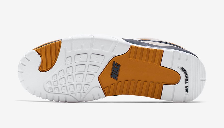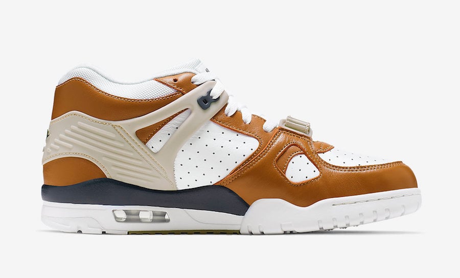 This Nike Air Trainer 3 comes dressed in a White, Midnight Navy, Ginger and Light Bone color combination. Just like the original release, it features White leather across the upper while both Ginger and Navy Blue lands on the overlays. In addition we have Light Bone and White across the midsole with a visible Air Max unit.
