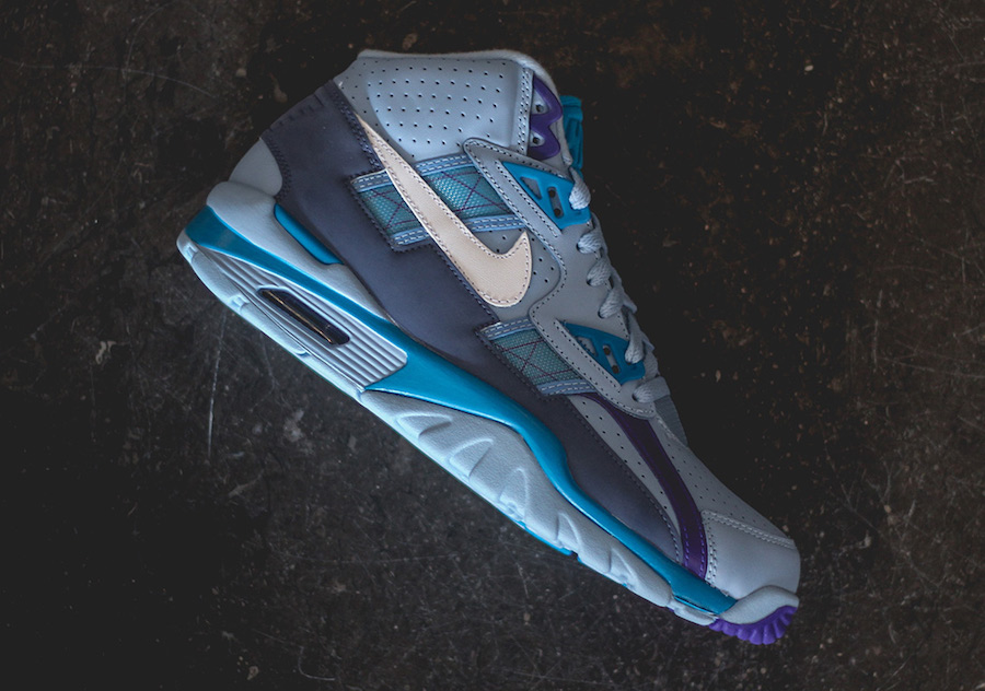 This SC Trainer High features shades of Blue throughout which is Leche Blue and Neo Turquoise. In addition we have White which lands on the Nike Swoosh logo while Purple hits sides, top eyelets and outsole to complete the look.