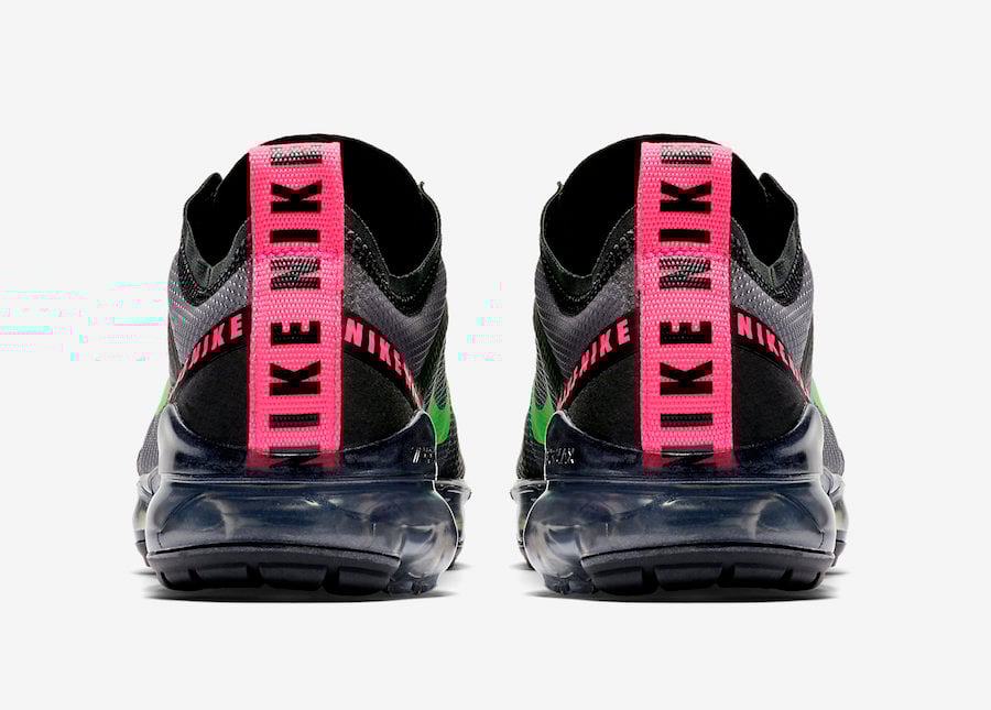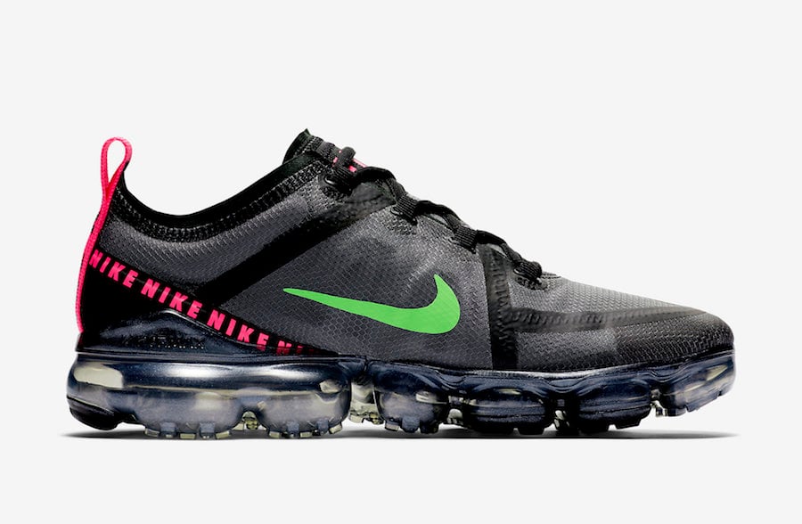 This Nike Air VaporMax 2019 comes dressed in a Black, Hyper Pink and Scream Green color combination. Utilizing Black on the base while both Pink and Green accents are spread throughout. Following we have a transparent VaporMax unit while bold NIKE branding is used on the tongue, rear panel, heel pull tab and insoles.