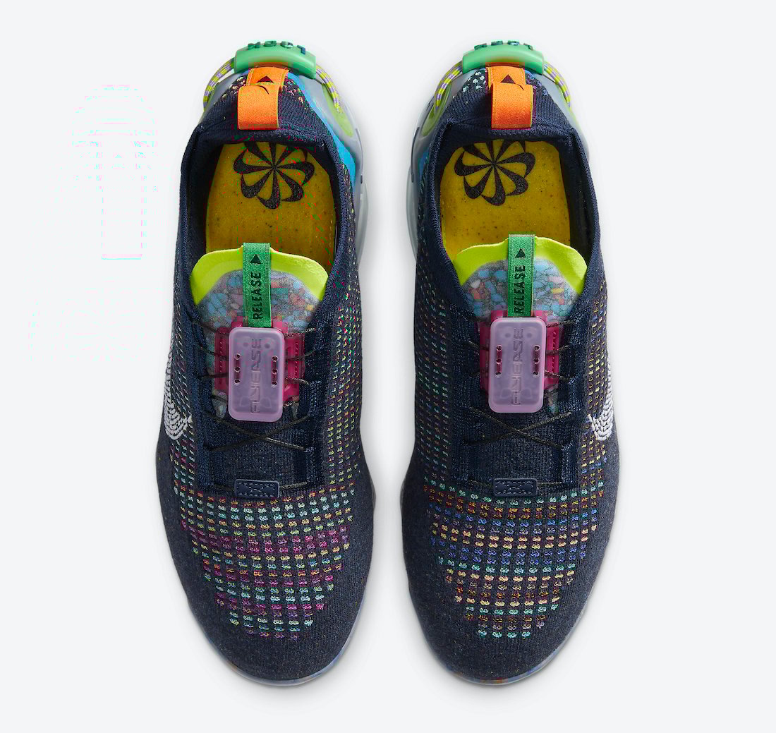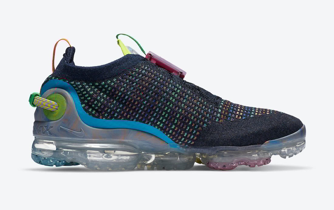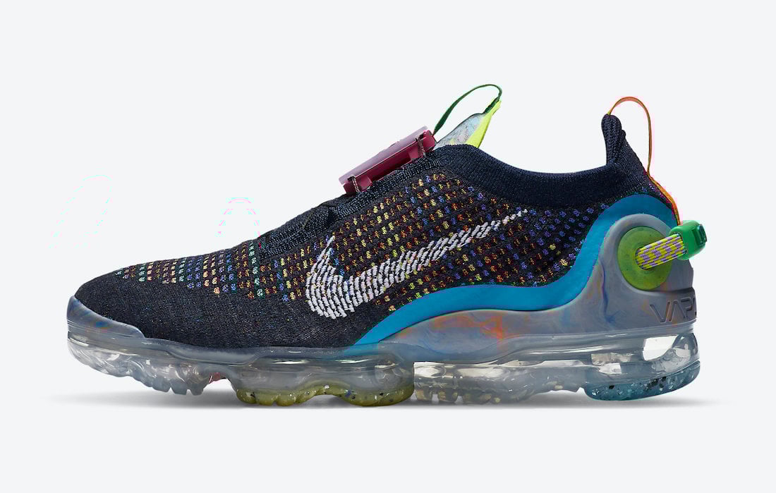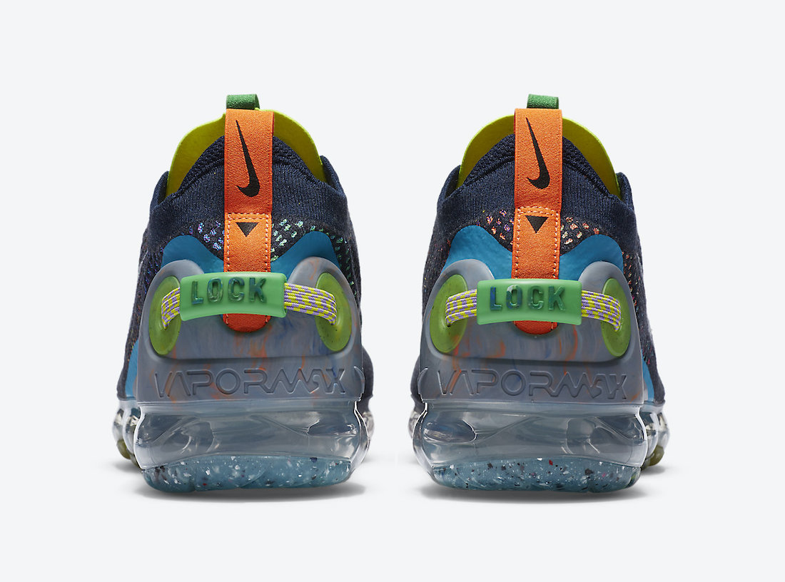 This Nike Air VaporMax 2020 comes dressed in a Deep Royal Blue, White and Multi-Color color combination. Utilizing Royal Blue on the Flyknit upper with Multicolor knits that are constructed with recycled polyester yarns. They also come with FlyEase lacing technology, a marble design on the heel while a recycled full length VaporMax Air unit finishes the look.
