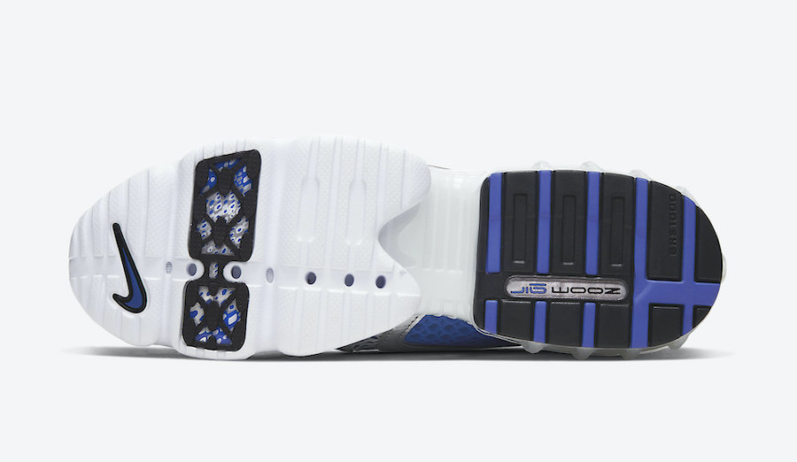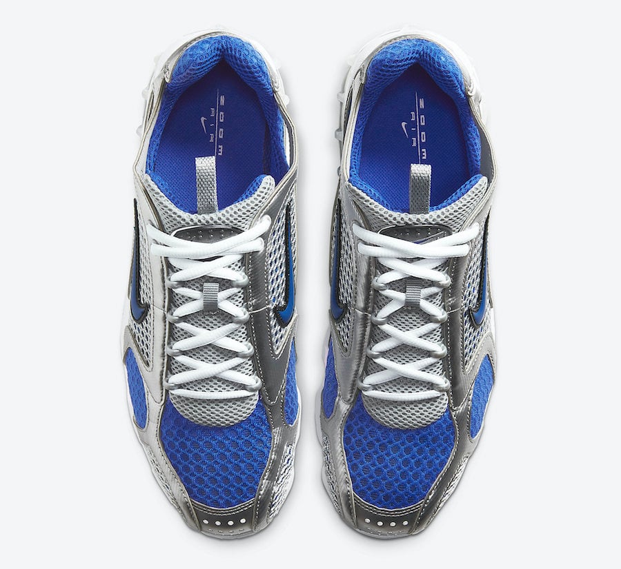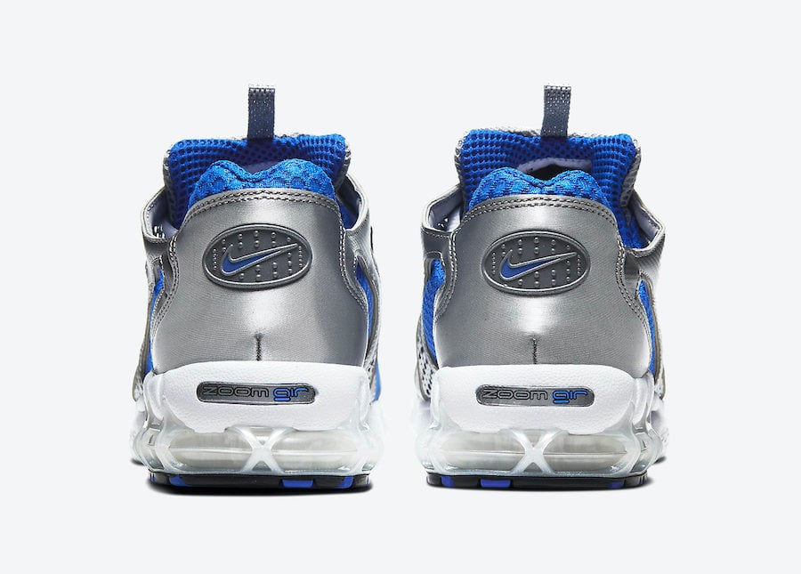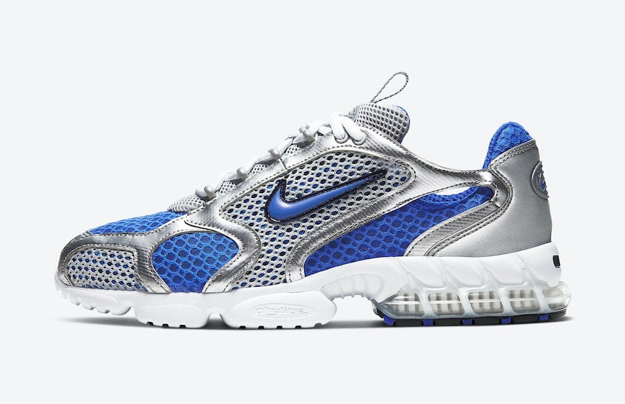This Nike Air Zoom Spiridon Cage 2 comes dressed in a Metallic Silver, Royal, White and Black color combination. Highlighted with Silver and Royal Blue mesh across the upper while Silver leather is applied to the overlays. Following we have White on the laces and midsole while a Black rubber outsole completes the look.