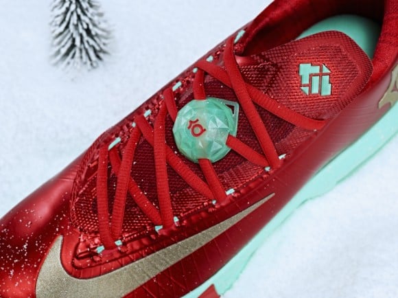 Kevin Durant takes the court in Christmas red with accents of gold and mint. With a twist on traditional Christmas prints, the KD VI features a Fair Isle style Christmas sweater pattern that incorporates trees, stripes, and his number 35. Christmas plaid adorns the collar lining, with decorative detail worked into the metallic red Nike Flywire technology upper and a mint green speckled sole. It’s the perfect outfit for this year’s festivities.
