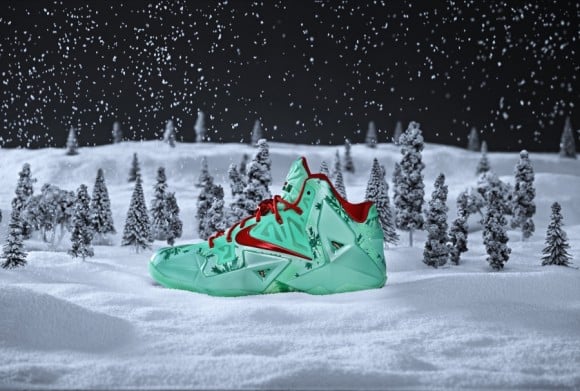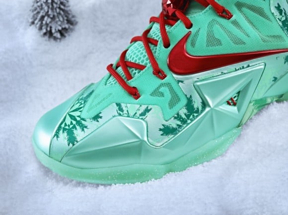 Snow on the leaves? Never in Miami, but this year LeBron James brings the spirit of the season to the beach with this special edition of the LEBRON 11. A chilly mint color takes on a Christmas green with bold red accents and a frosty translucent outsole. The unique geometry of a snowflake combines with the royal palm to create a kaleidoscopic ‘palmsicle” print.