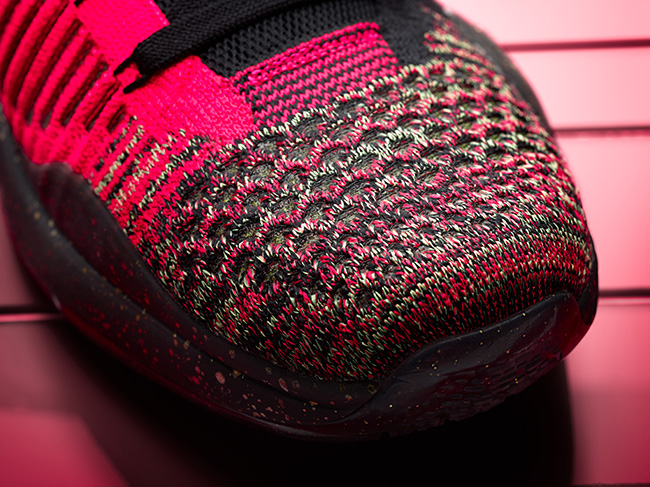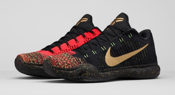 Kobe Bryantโs tenth signature shoe features a fiery multicolor Flyknit on the toe and five golden rings on the heel, as a festive nod to the player’s championship success. Red, black and gold add subtle holiday hints.