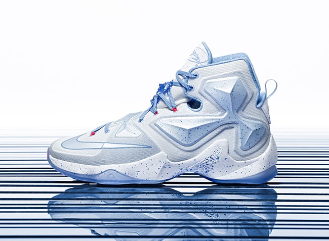 Fierce Midwest winters inspire the icy blue hues that run throughout the LeBron 13, along with creative Christmas details appearing in the lace lock, pearlescent blue Hyperposite technology and shattered ice-inspired โ13โ on the heel.