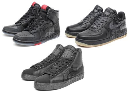 Continuing with Nike‘s latest obsession with the color black, Nike is set to release three new models with a full black colorway. Lately, we have seen theย Nike Sportswear Lunar Racer – Black Collectionย and theย Nike Sportswear Blackout Collectionย which both feature sneakers fully coated in black. These three pairs of black sneakers include the Nike Blazer High, the Nike Dunk High, and the Nike Air Force 1 Low. Theย Nike Blazer High is decked out in black from head to toe. The Nike Dunk High features a black upper, but also includes a clear sole and red accents. The last model of this installment, theย Nike Air Force 1 Low, also yields a black upper, but a little color is added to this pair through the use of a gum sole. There is no word on an exact release date yet, but you can buy your pair today at A.R.C. in New York.