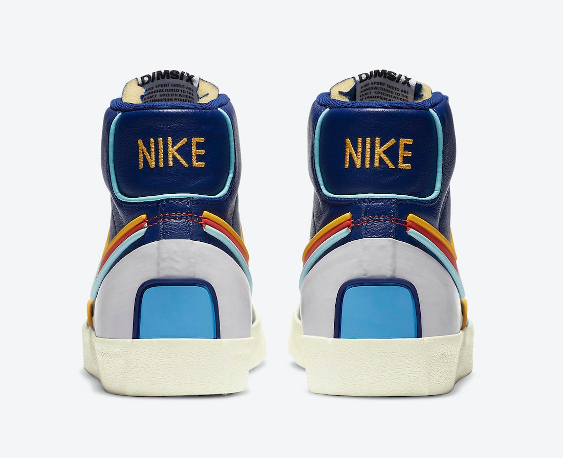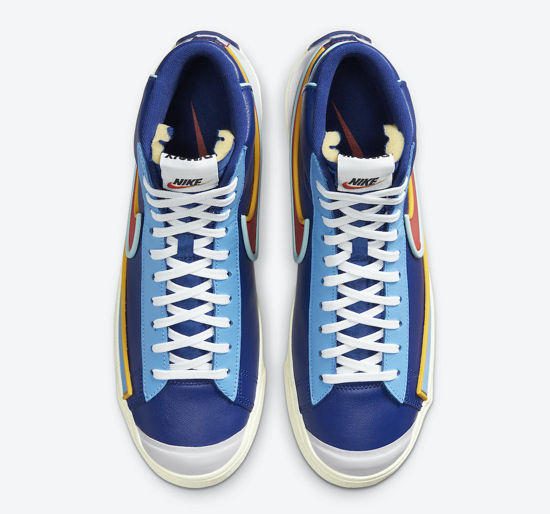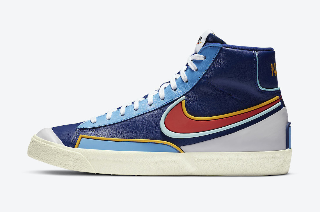 First, going over this Nike Blazer Mid, it comes dressed in a Deep Royal Blue, Chile Red, and Copa color combination. Following, Dark Blue leather starts this pair off on the base, and the overlays feature shades of Red, Orange, and Blue. Synthetic leather lands on the Swoosh with Multicolor pipping. Additionally, the heel and forefoot receive the same treatment. A padded tongue, D/MS/X branding, and Sail on the midsole and rubber outsole complete the look.