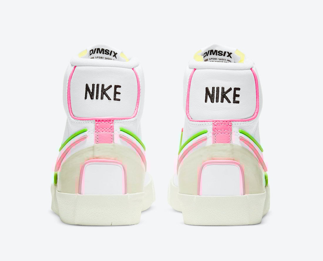 This Nike Blazer Mid features a White, Electric Green, and Sunset Pulse color combination. First, the pair comes with White leather across the base while both Green and Pink adorn the overlays. Using synthetic material, which outlines the Swoosh, forefoot area, and heel. Following, Black branding hits the foam exposed tongue and insoles while the inside of the tongue adorns D/MS/X branding. Finally, a White midsole and matching rubber outsole finishes the look.