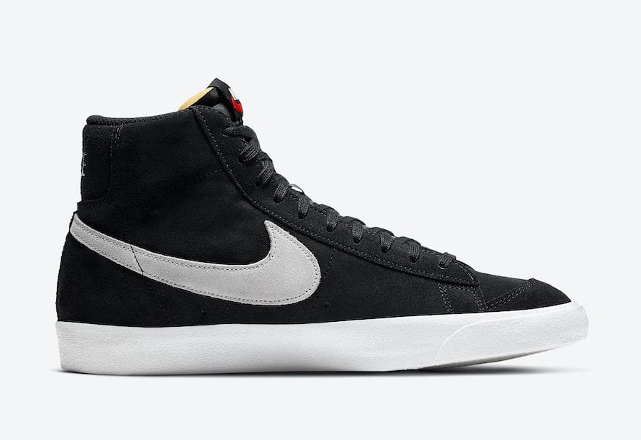 Looking closer this Nike Blazer Mid comes with Black suede across the base while a Grey like Thur is applied to the Swoosh logo. We also have โNIKEโ text on the heel, padded tongues and White on the midsole and rubber outsole which finishes the look.