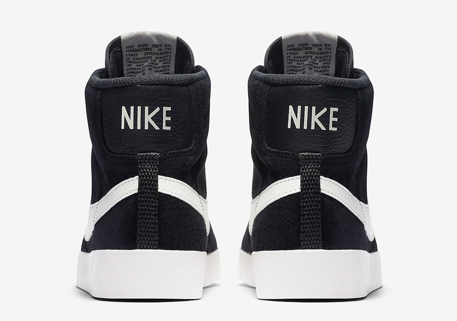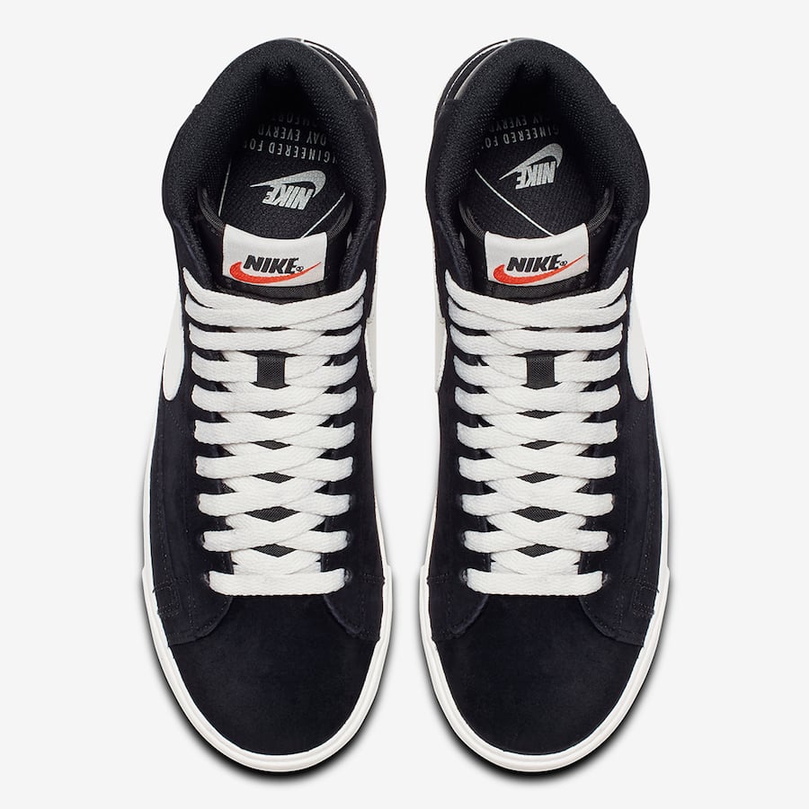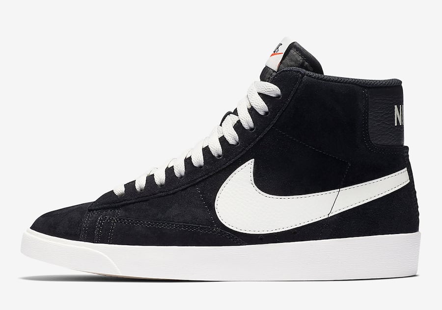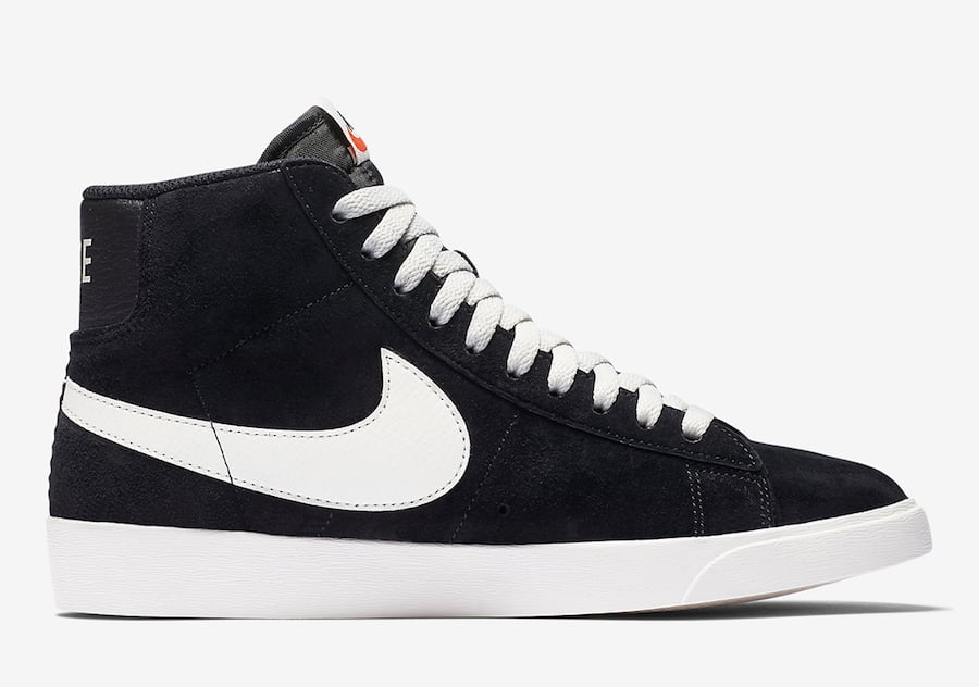 Looking closer, this Nike Blazer Mid features Black suede across the upper while Black tumbled leather lands on the heel. In addition we have a nylon tongue, Sail on the laces, tongue label, Swoosh, midsole and rubber outsole which completes the look.