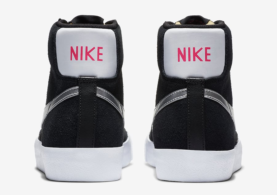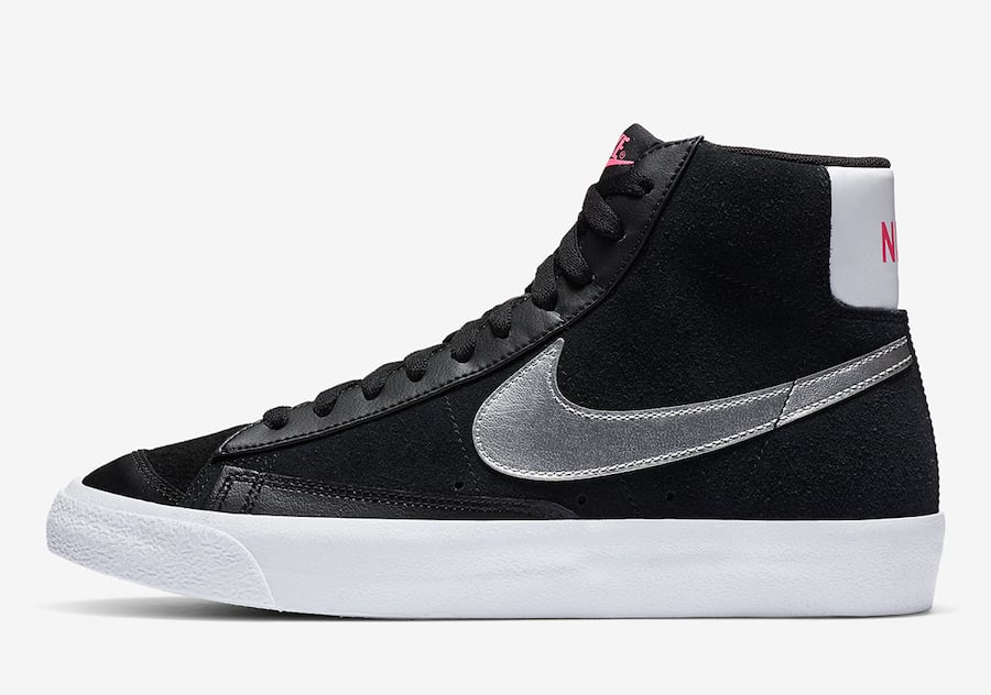 Looking closer this Nike Blazer Mid comes dressed in a Black, White, Pink Blast and Metallic Silver color combination. Highlighted with Black suede on the upper while leather lands on the overlays. Matte Silver lands on the Swoosh logos, White on the leather heel and Pink is applied to the branding. Completing the look is White on the midsole and rubber outsole.