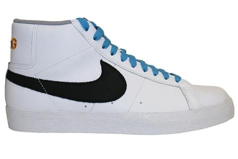 A simple colorway with your basic white leather upper and black canvas swoosh on the side panels. What makes this shoe stand out is the use of blue laces (this is an easy addition to any basic Blazer colorway) along with the โBen Gโ branding in place of the usual โNikeโ on the heel tab.