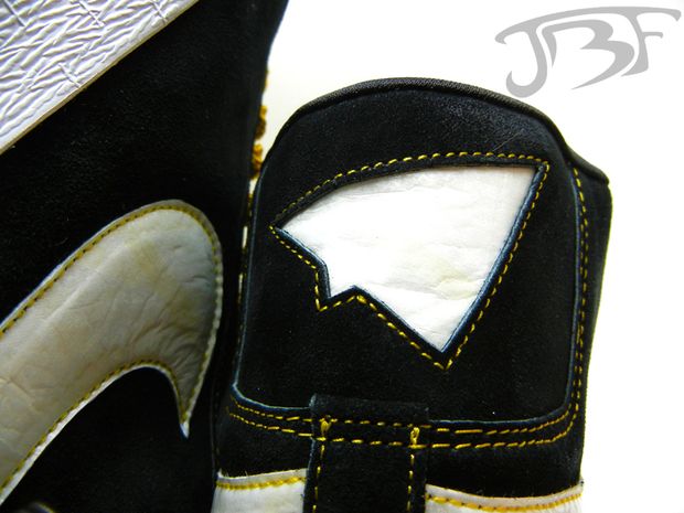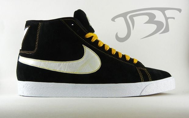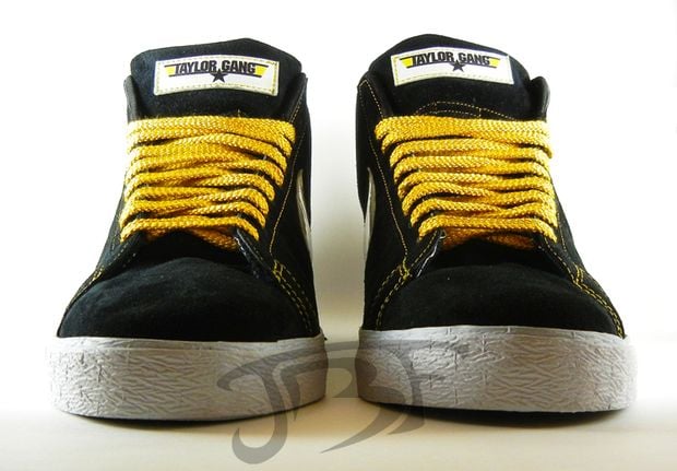 When we see customs that catch our eye, we post them. These are one of those customs. JBF is at it again with a very, very limited custom sneaker available to 20 lucky customers who are first in line purchase a made-to-order pair. The Nike Blazer SB is done up “Taylor Gang” style in “Black and Yellow” with an all-black soft suede upper, yellow accent stitching and something new and unique, a Swoosh and heel tab backing constructed out of rolling paper. This very creative Blazer SB also sports the “Taylor Gang” logo on the tongue. Be sure to stop by JBF for more of his work or to order a limited edition pair, if there any left.