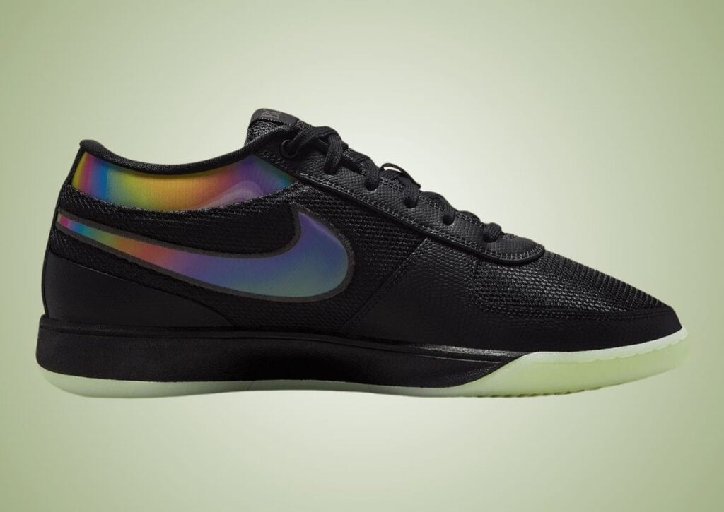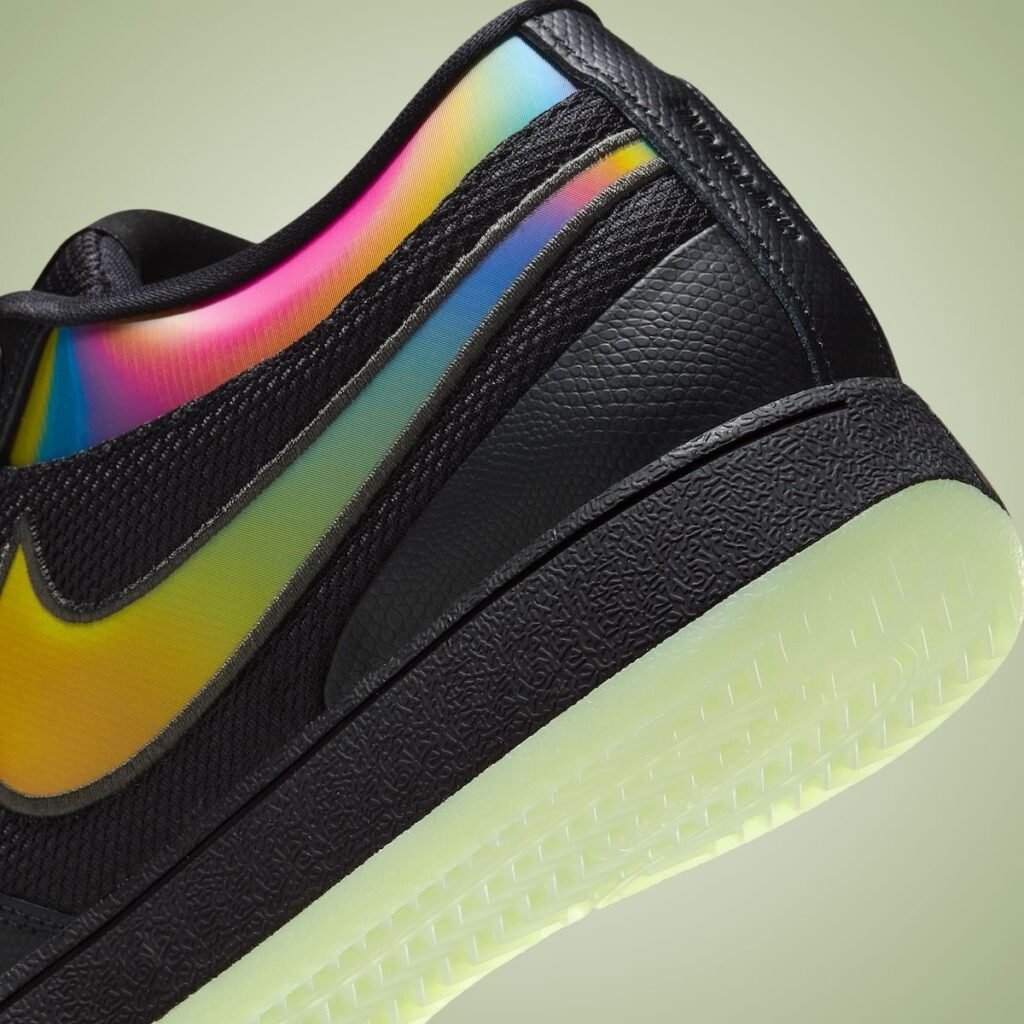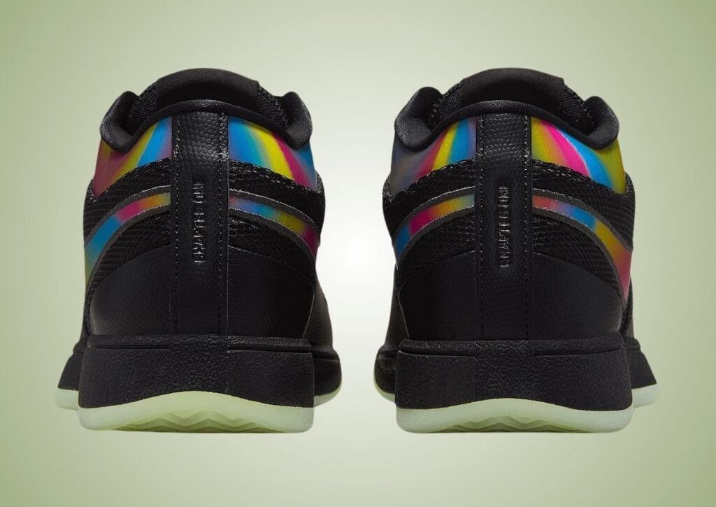 This Nike Book 1 features a Black, Multi-Color, and Medium Ash color scheme. As you can see, the shoes feature Black across the upper with a combination of mesh and leather. The leather also has a snakeskin-like texture, giving the shoes an exotic feel. We have a lenticular design on the Swoosh logos and ankle, shimmering shades of Blue, Red, Orange, and Yellow to further the look. Other highlights include a Black midsole and a glow-in-the-dark rubber outsole.