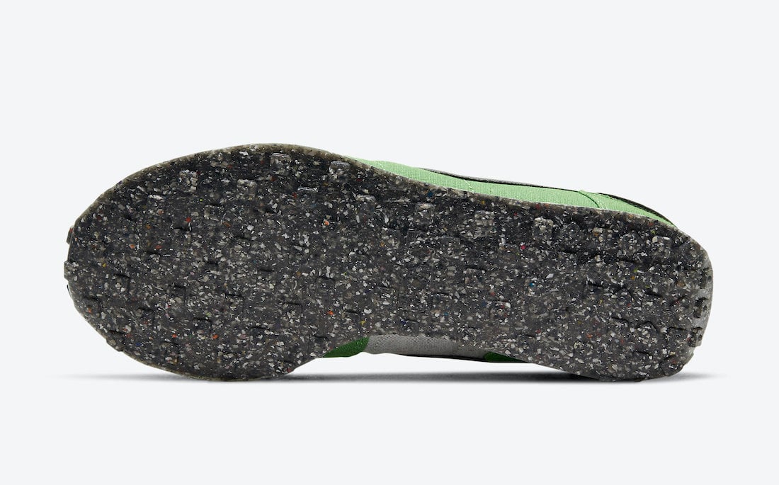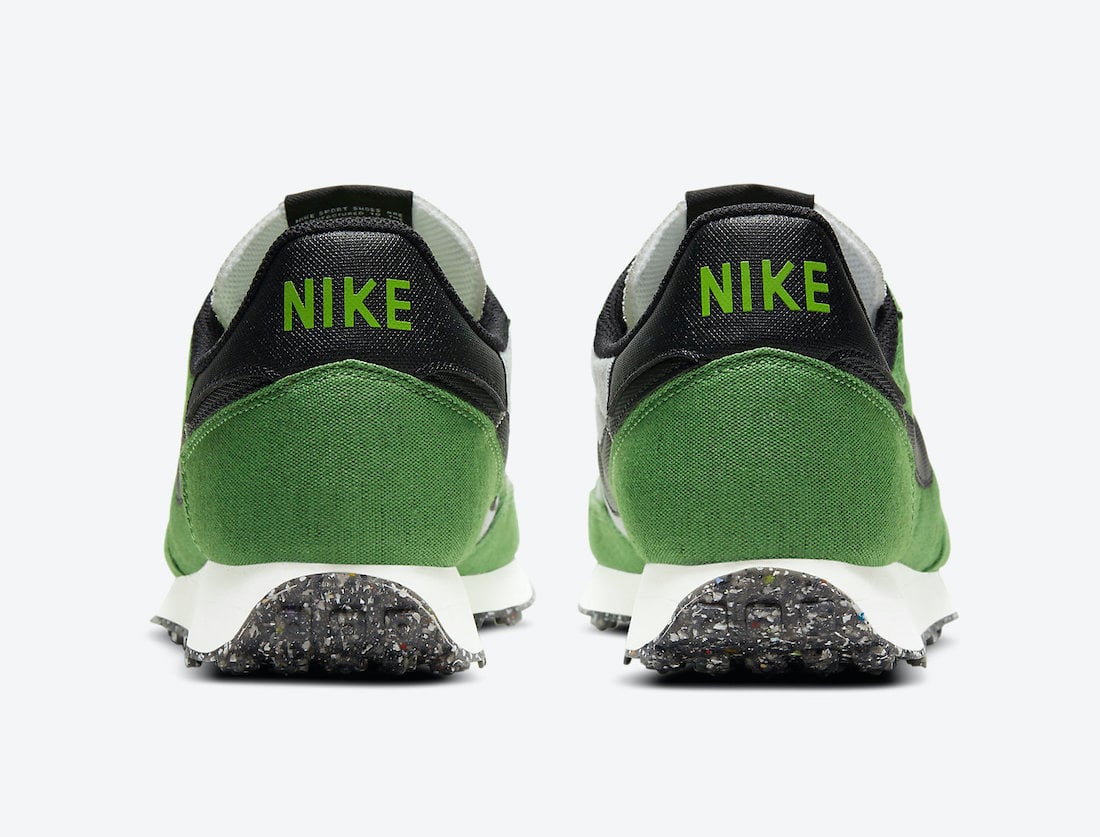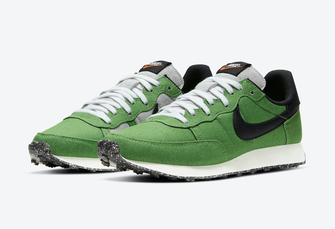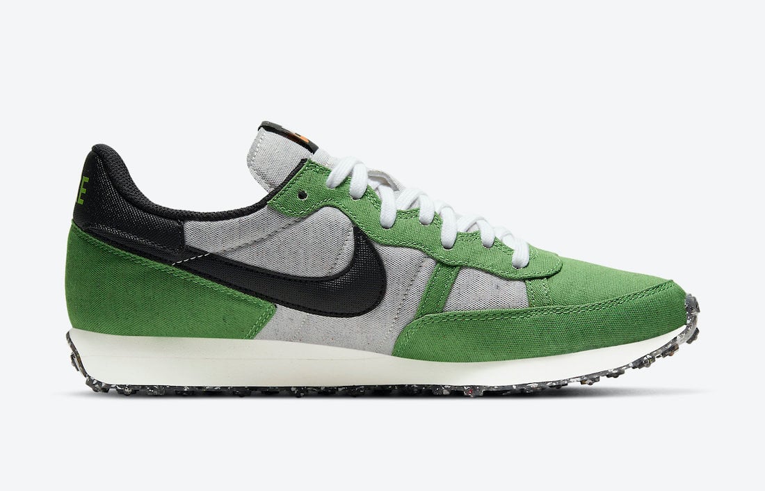 This Nike Challenger comes dressed in a Mean Green, Black, Sail, and White color combination. First, the pair features at least 20% recycled materials while Green textile adorns the upper. Next, Black adorns the Swoosh and heels while Volt runs across the insoles. Finally, a White midsole and a speckled outsole thatโs made from 15% Nike Grind rubber finish the look.