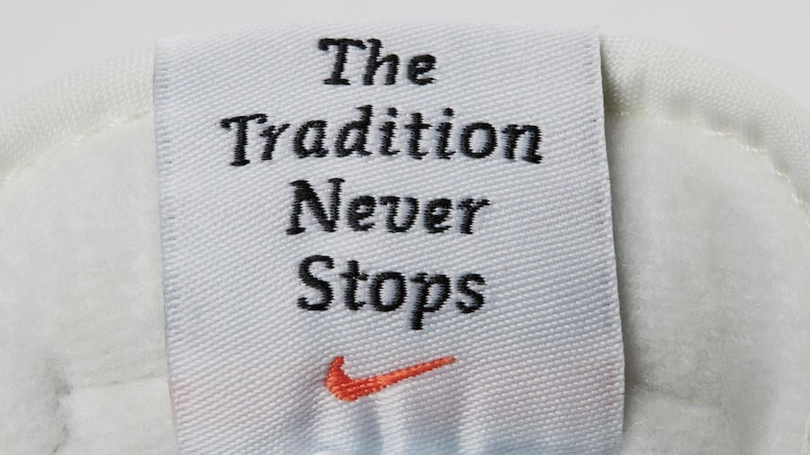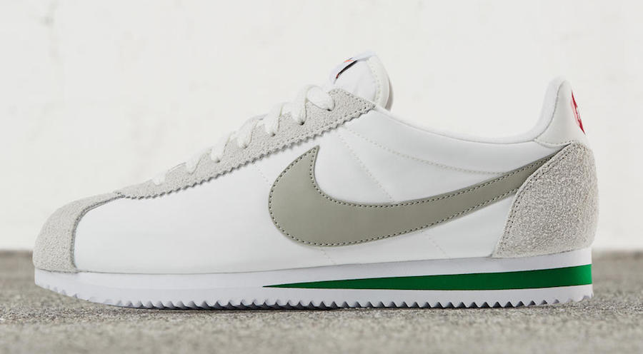 Looking closer, this Nike Cortez features White nylon across the uppers while Ivory suede lands on the overlays. Ivory is also placed on the Nike Swoosh while Pine Green is striped across the midsole. Other details include Red accents, Red stop sign on the heel, โThe Tradition Never Stopsโ on the inside of the tongue and White on the outsole.