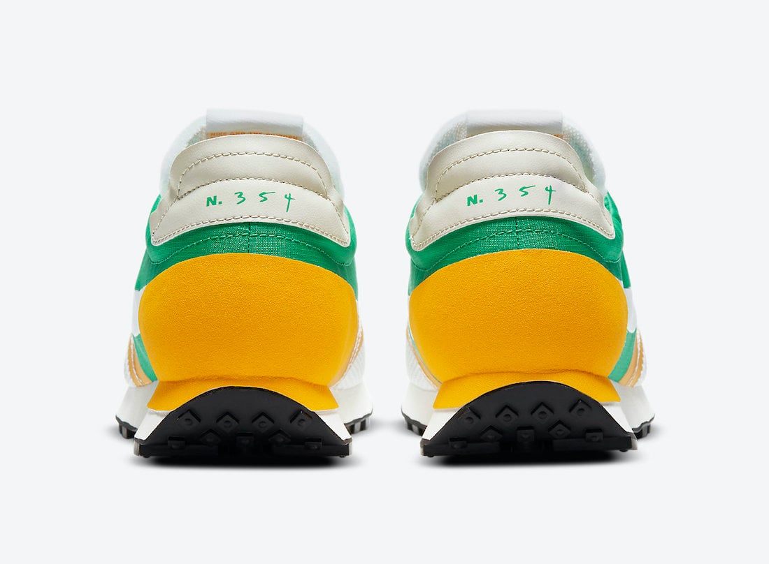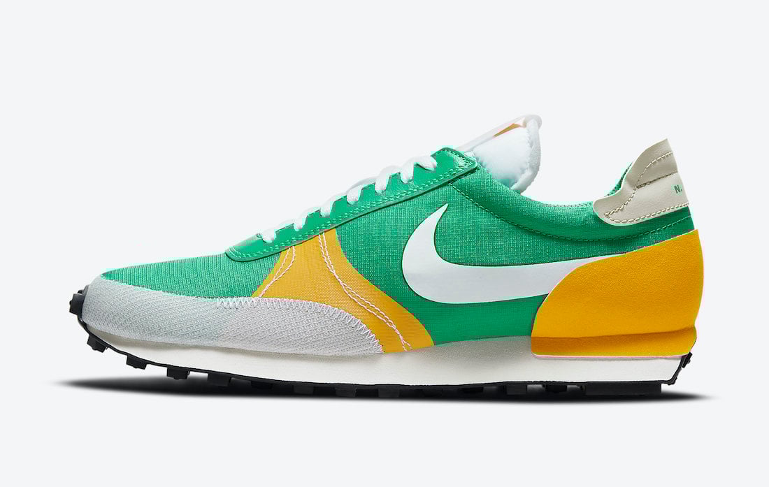 Looking closer, this Nike Daybreak features a Stadium Green, White, and University Gold color combination. Highlighted with a technical look and no-sew skins. Next, Green covers the ripstop upper while Yellow lands on the forefoot and wraps the heel. Following, White runs across the Swoosh, tongue, laces, and midsole. Finishing the look we have a Black waffle rubber outsole.