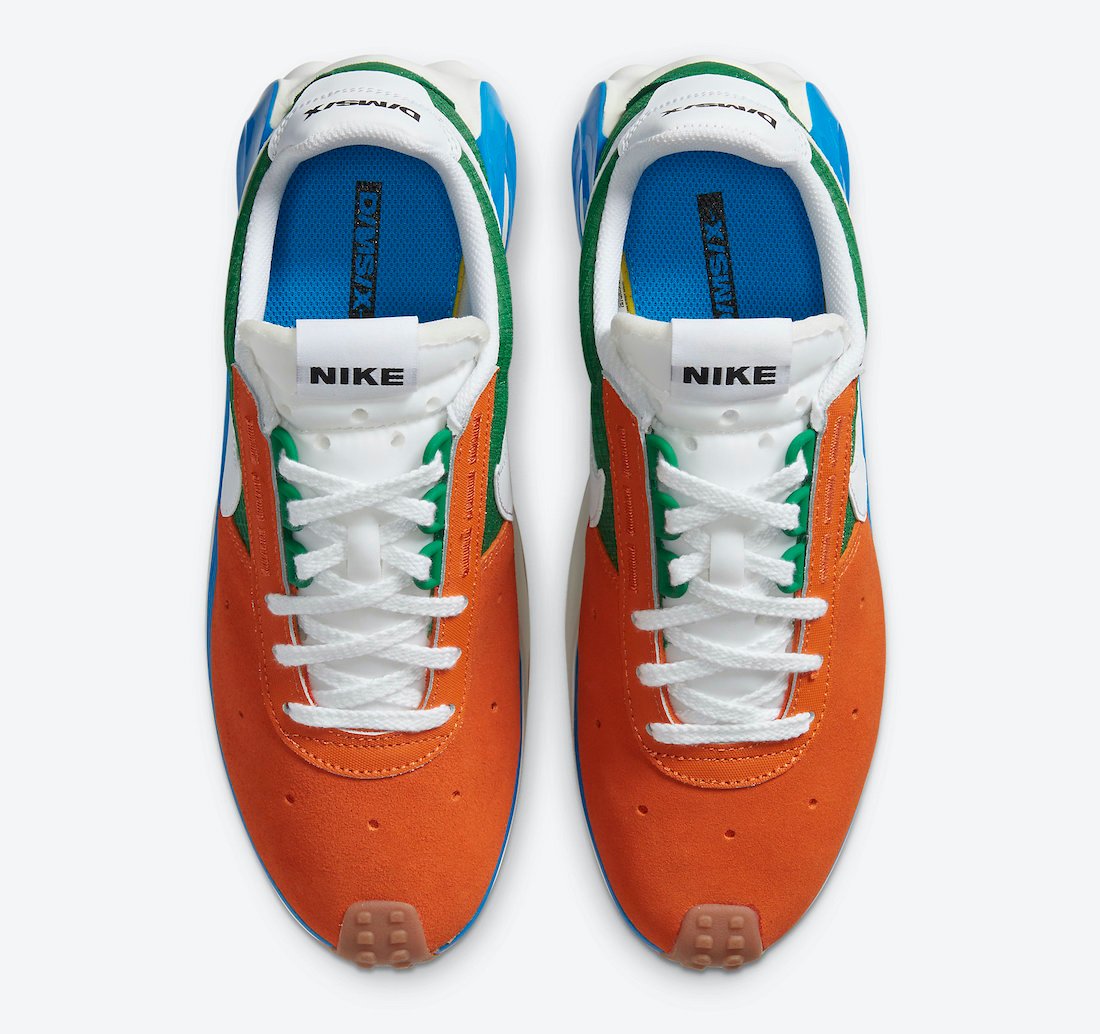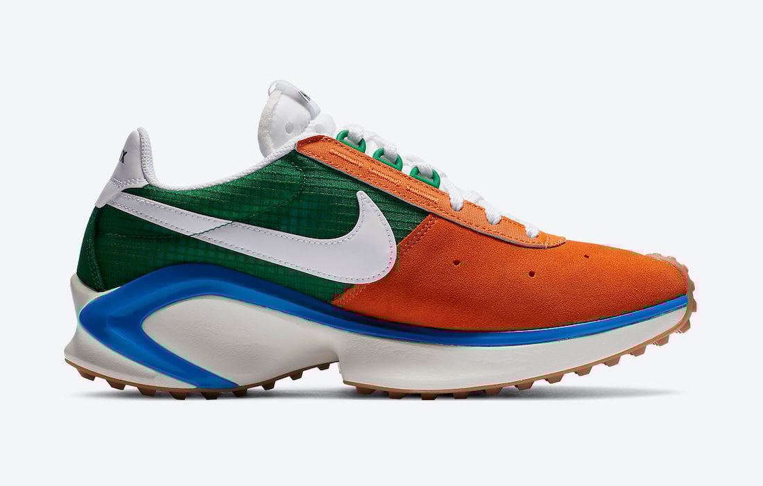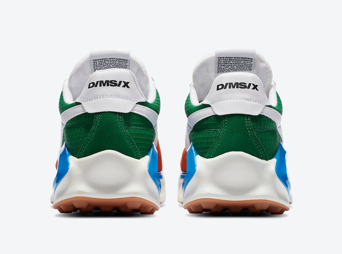 Looking closer this pair comes dressed in a Starfish, White, Pine Green and Sail color combination. Utilizing Orange across the front while Green wraps the heel. White is then seen on the Swoosh, tongue, laces, heel and midsole. D/MS/X branding is placed on the heel while a Blue plastic piece runs across the midsole. Finishing the look is a Gum waffle rubber outsole.