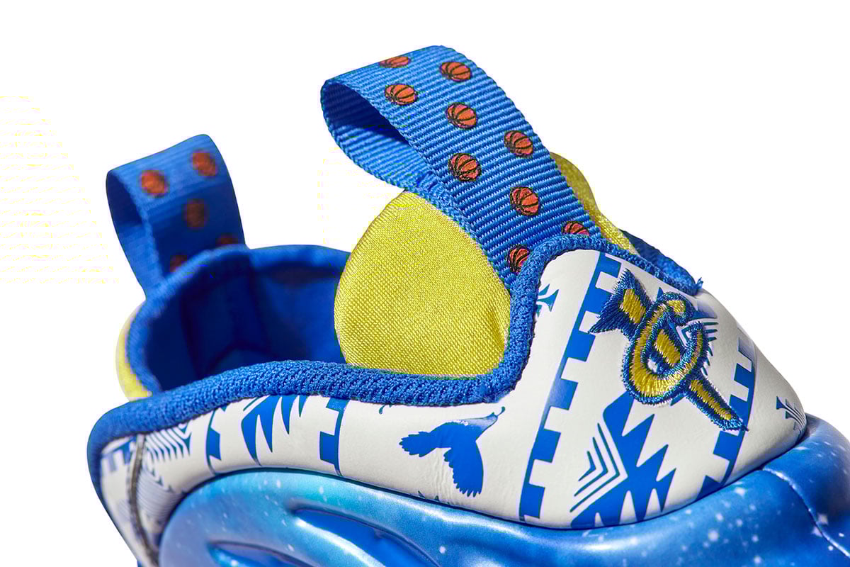 As a proud member of the Klamath Tribes, Coley Miller found plenty of design inspiration within her culture. Her Air Foamposite One features a basket weave graphic that incorporates a quail plume and the Klamath mountains. The night sky graphics are inspired by stargazing with her mother, who donated one of her kidneys to Coley. As for the phrase โho mas giโ on the outsole, thatโs a reminder to Just Do It in Coleyโs Klamath language.
