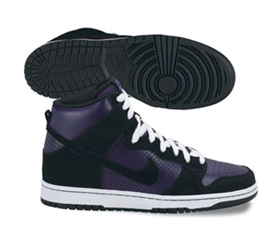 Here we have a sneak peek of what’s in store next summer for Nike SB. The Nike Dunk Hi Pro SB will come in a black/grand purple colorway. The upper consists of a perforated grand purple leather upper, with black panels and swoosh to contrast the purple. The black and purple are offset by a white midsole, which sits between the upper and black outsole. White laces give a nice ring to the shoe, which should be a great release next summer.