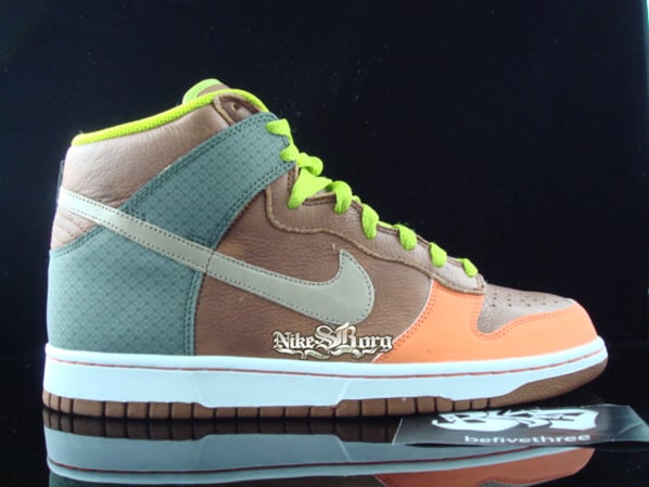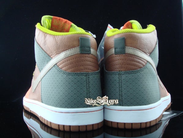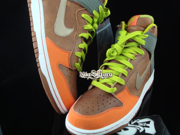Pictured is a new sample Nike Dunk High using Brown/Orange-Champagne Beige colors. Nike had a nice plan and used the colors wisely as they used pebbled leather, green laces, with print on the flap. Orange suede is at the toe box area which all in all will get a lot of looks. Via nsb.