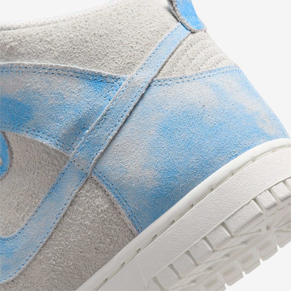 This Nike Dunk High features a University Blue and Sail color combination. Constructed with suede with Sail on the base, toe, and ankle. Highlighting this pair is clouds on the Swoosh logos and overlays. Finishing the look is a Sail midsole and a matching rubber outsole.
