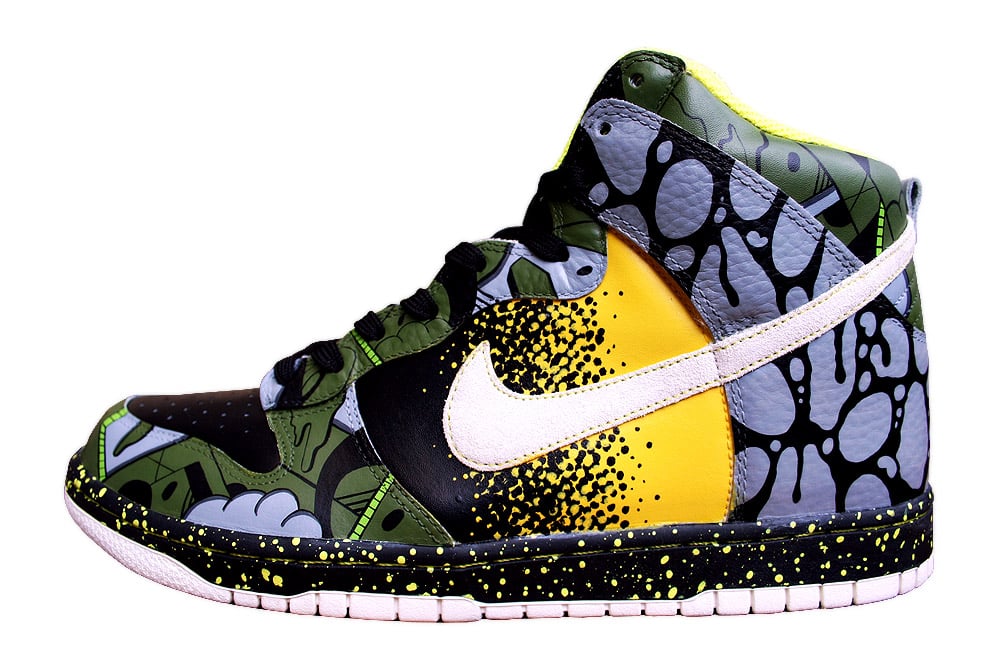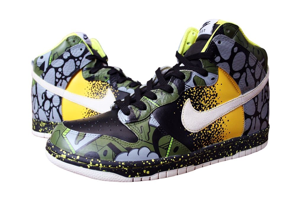 The Nike Dunk High is one model that seems to get the custom treatment most often due to the endless colorways and classic silhouette. This particular custom is a sequel to the 2010 Nike Dunk Serpent, now dubbed the Serpant II. Custom artist Sekure D has taken this pair to a whole other level with its abstract graffiti and carnage print patterns. Add to that a tech fade mid panel and speckled outsole and you have yourself a great wearable piece of art.