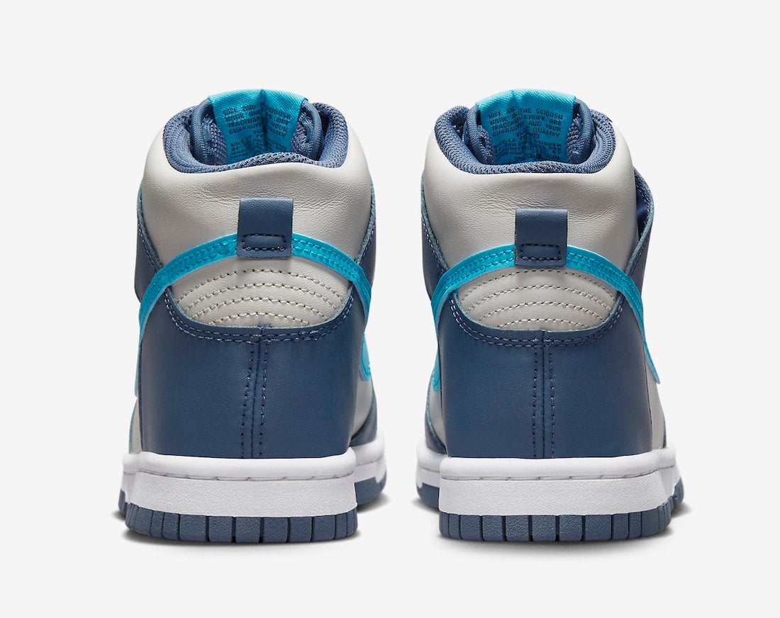 This Nike Dunk High features Bone on the base while a darker shade of Blue appears on the overlays, eyestay, laces, and heel. Next, a lighter shade of Blue adorns the Swoosh logos and tongue label. Constructed with leather throughout and mesh on the tongue, a White midsole and a Blue rubber outsole finish the look.