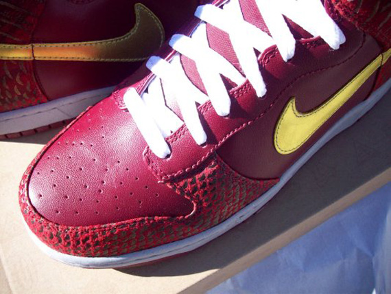 The West just got another team player as Nike releases another shoe as part of the Rivalry Pack. With the creativity of UNDFTD’s Eddie Cruz, the Nike Dunk High Premium can’t go wrong, as it takes influence from the USC Trojans, in this team red/voltage yellow-white colorway. The Dunk High Premium once again uses the snakeskin design, but in team red with metallic gold on the swoosh. All the key characteristics of a Rivalry Pack shoe comes standard, like the representative tongue tag and printed character on the insole. This shoe is available now as a December 2009 release at select Nike retailers such as Sneaker Bistro, but you can get it on eBay as well.