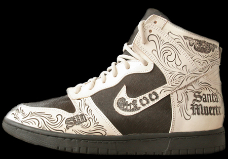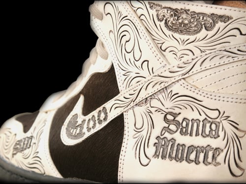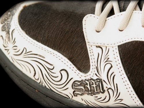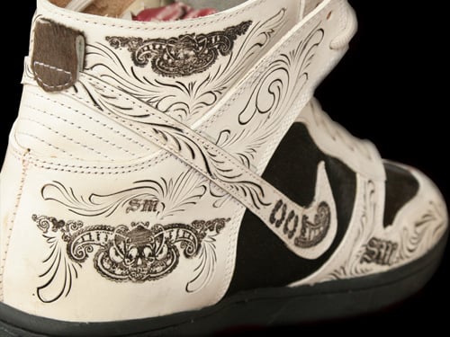One of the most creative Nike Dunk Highs I have seen in a while is created by Santa Muerte. This pair of Nike Dunk highs were actually created with a hand made tooling leather, but looks like they have been lasered. To finish this pair off, Santa Muerte added horse hair on the side panel and toe box. Via Slamxhype.