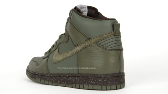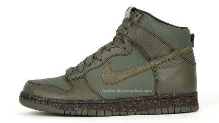 We have been seeing many previews of upcoming Nike Dunk Highs as of late, including the black/volt Dunk High and the swan/anthracite style. This time around, the classic Nike Dunk High silhouette hosts a tonal olive green upper accented by a speckled brown mid-sole, brown inner lining, and brown contrast stitching. Overall, this pair is quite different from anything we have recently previewed due to the fact that this style of the Dunk High features neither a very bright nor vivid colorway. The Nike Dunk High – Urban Haze/Baroque Brown is expected to release in December 2009. Via Footlocker.