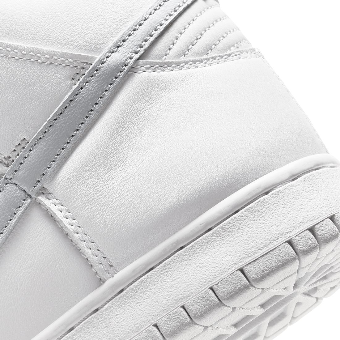 This Nike Dunk High comes dressed in a White and Pure Platinum color combination. Constructed with leather throughout, White hits the panels, overlays, eyestay, and tongue. In addition, Platinum adorns the Swoosh, insoles, and rubber outsole. Lastly, White laces and a matching midsole finishes the look.