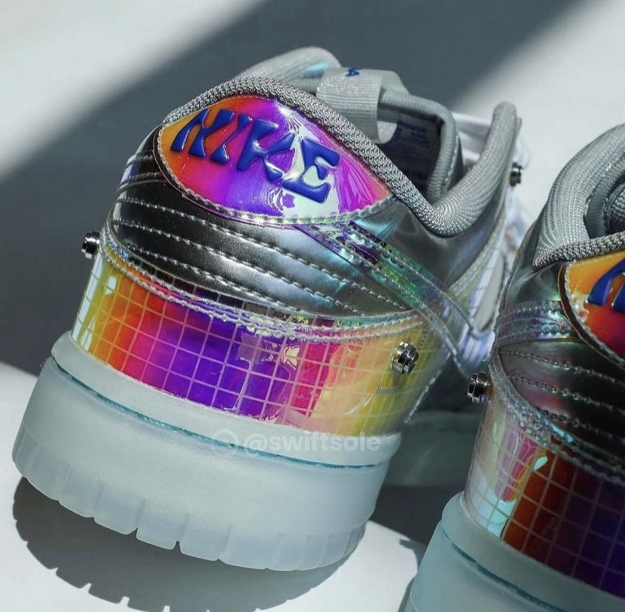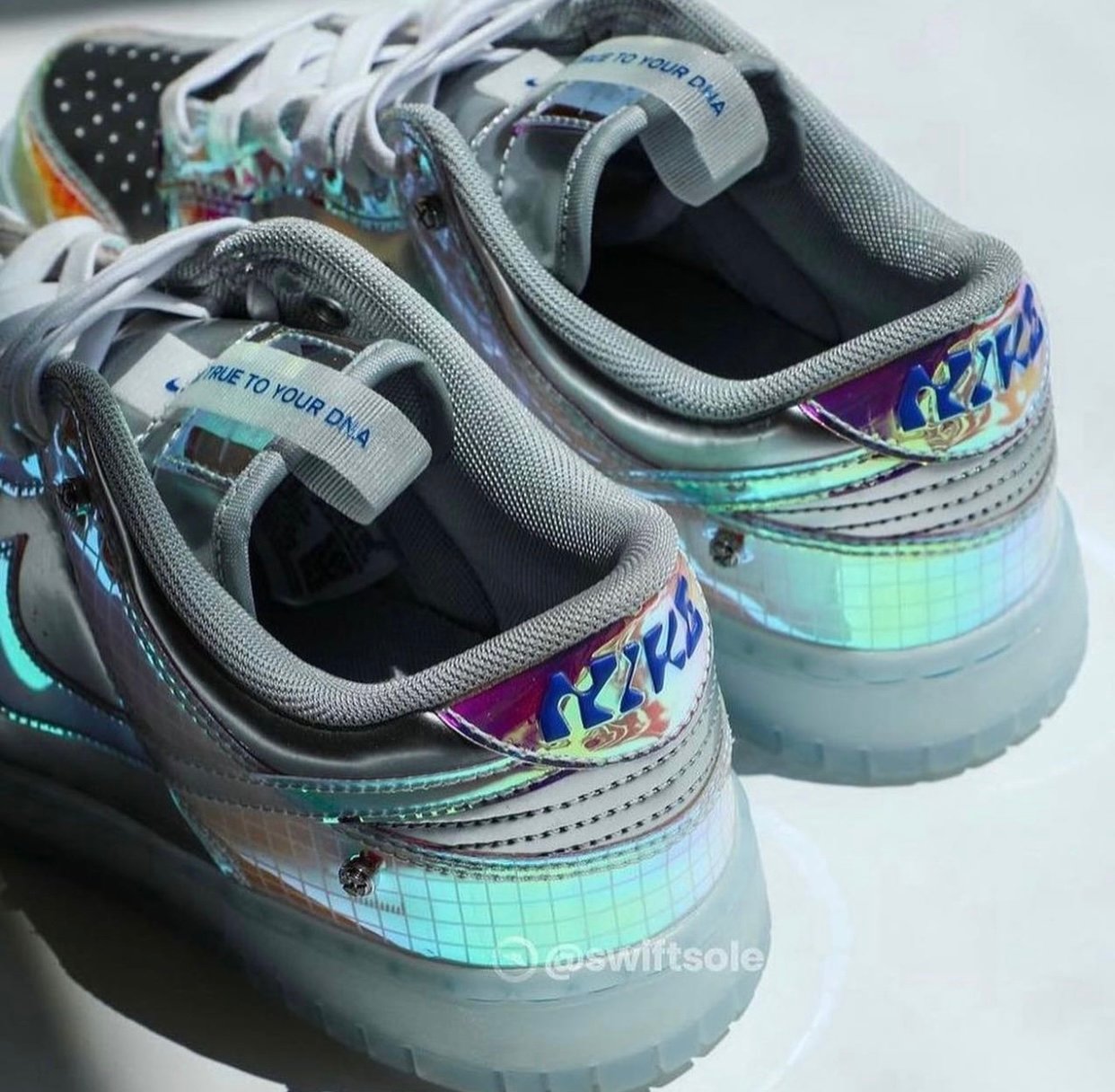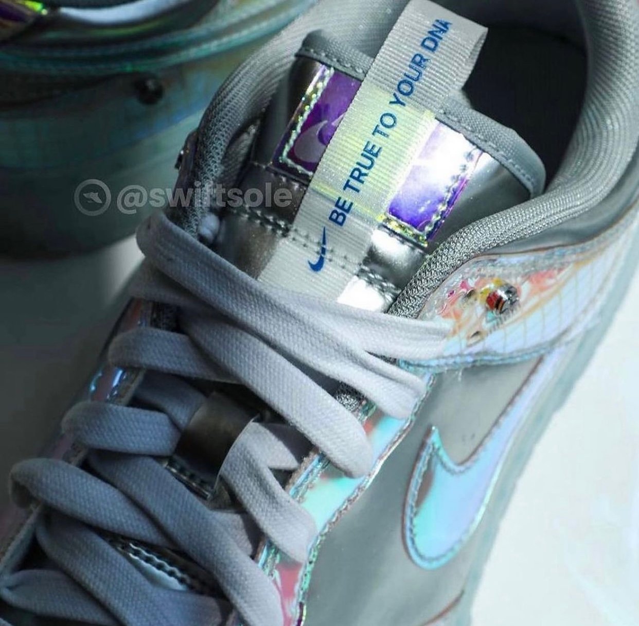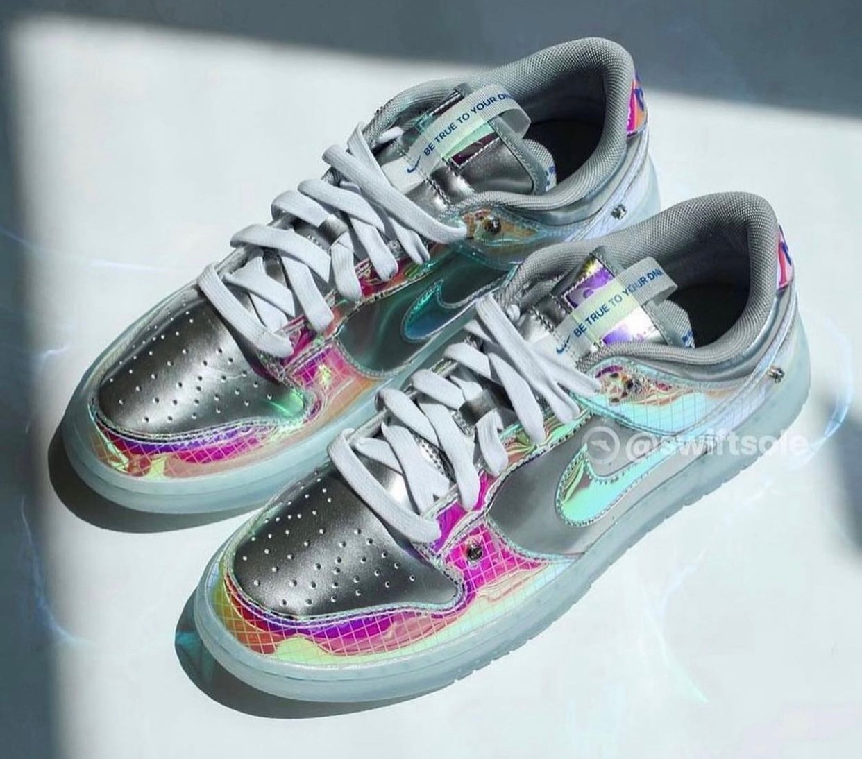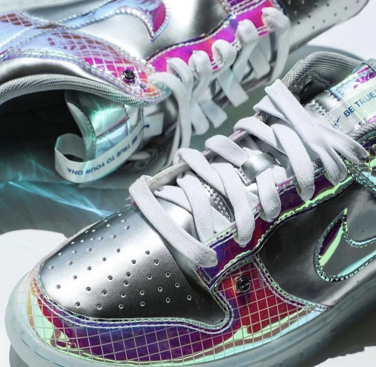 Looking closer, this Nike Dunk Low features Metallic Silver patent leather across the panels, toe box, and collars. Next, iridescent gradient adorns the overlays with a grid pattern overlay. More iridescent is applied to the Swoosh logos and White adorns the laces. More than likely, we will have โBe Trueโ branding throughout, including on the tongues, insoles, and heels. Finishing the look is a semi-translucent rubber sole.