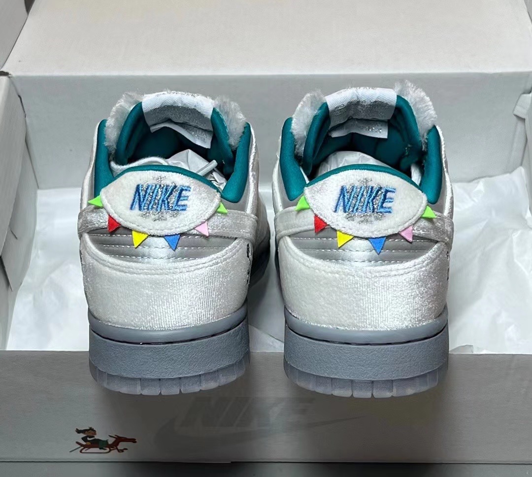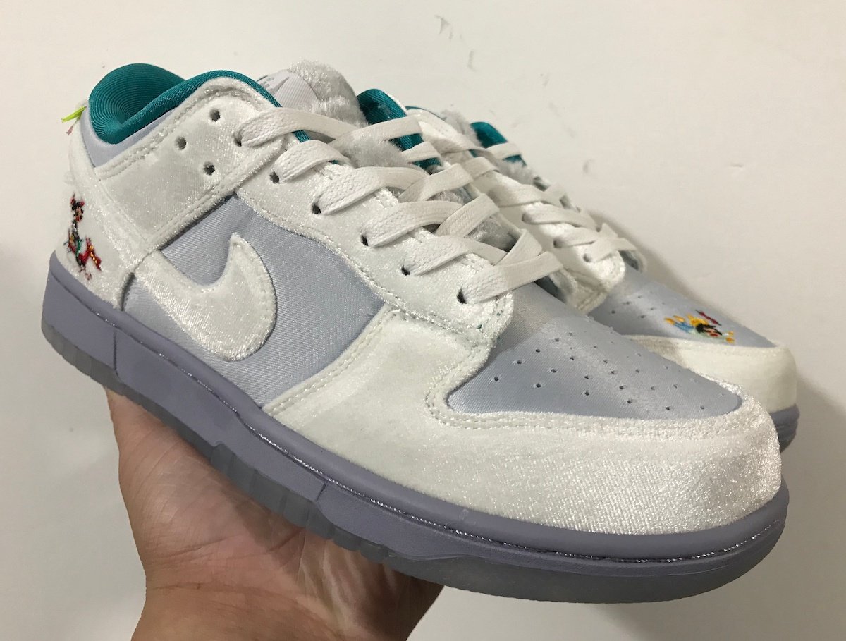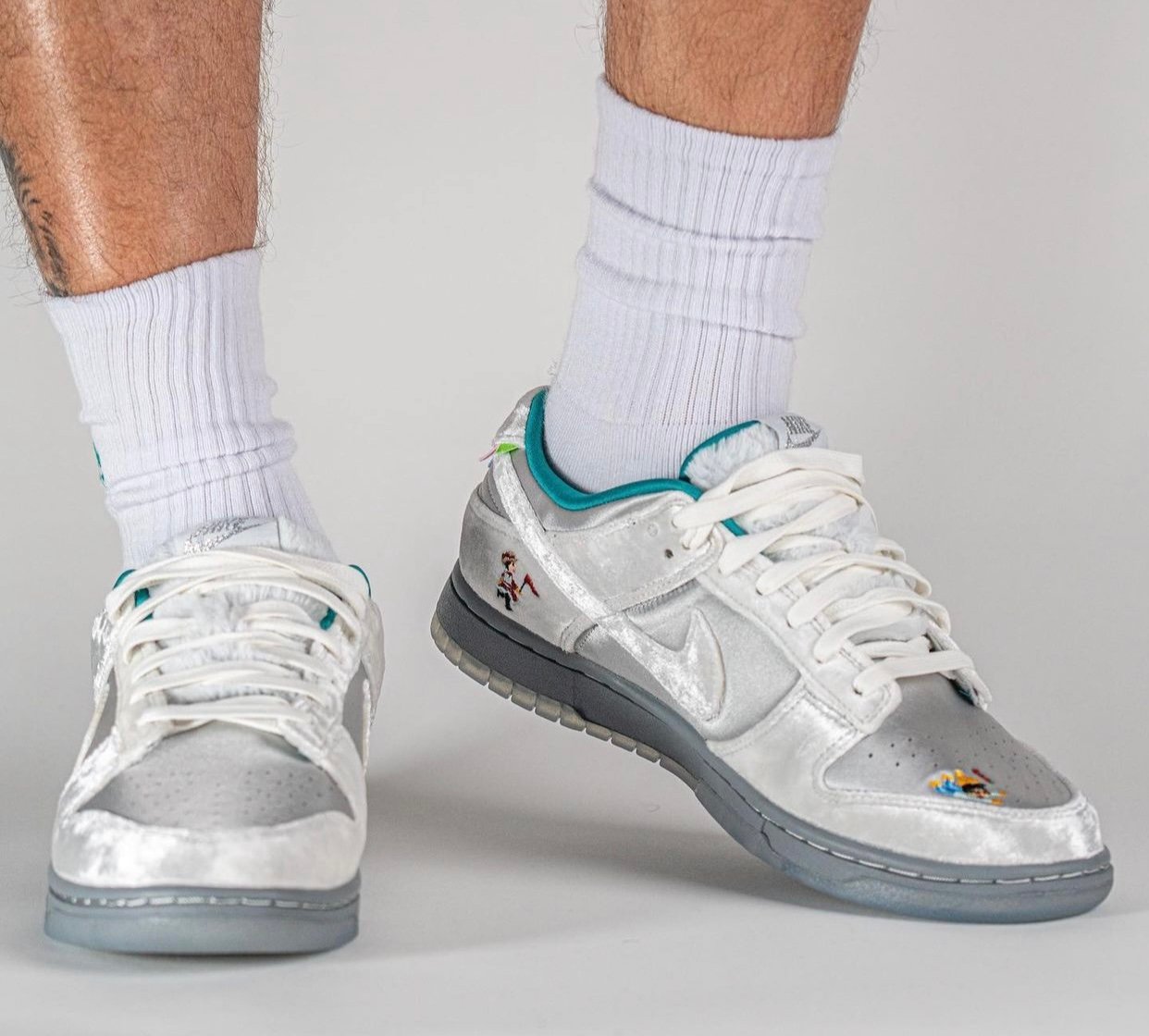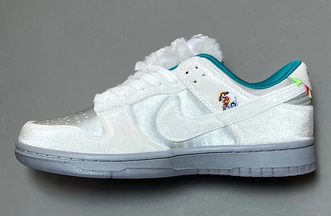This Nike Dunk Low comes highlighted with Matte Silver on the base, while White velvet adorns the overlays. Adding pop, Teal covers the liner, and White fur covers the tongue. A splash of colors land on the heel that forms a pattern typically worn by medieval jokesters. Next, we have kids playing in the snow with a sled while a kanji lands on the insoles that translate to โIce.โ Lastly, we have a Grey midsole and a translucent outsole with snowflakes.