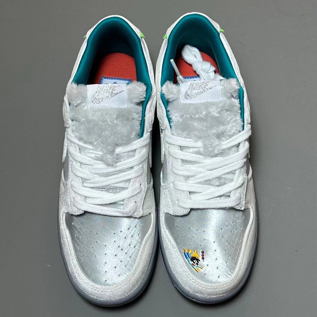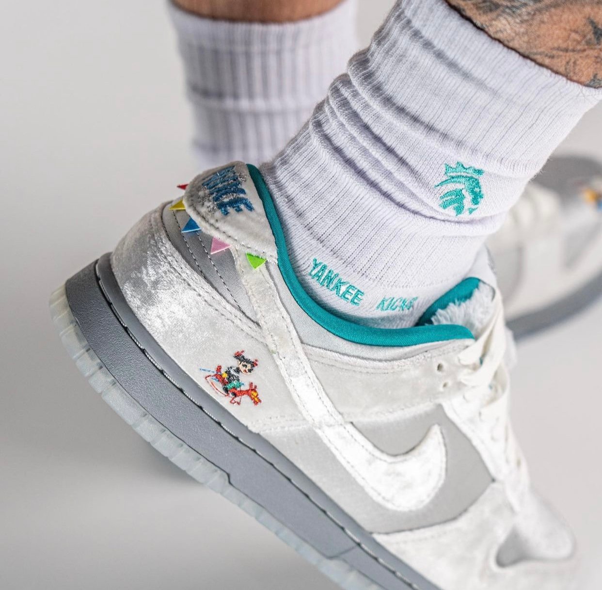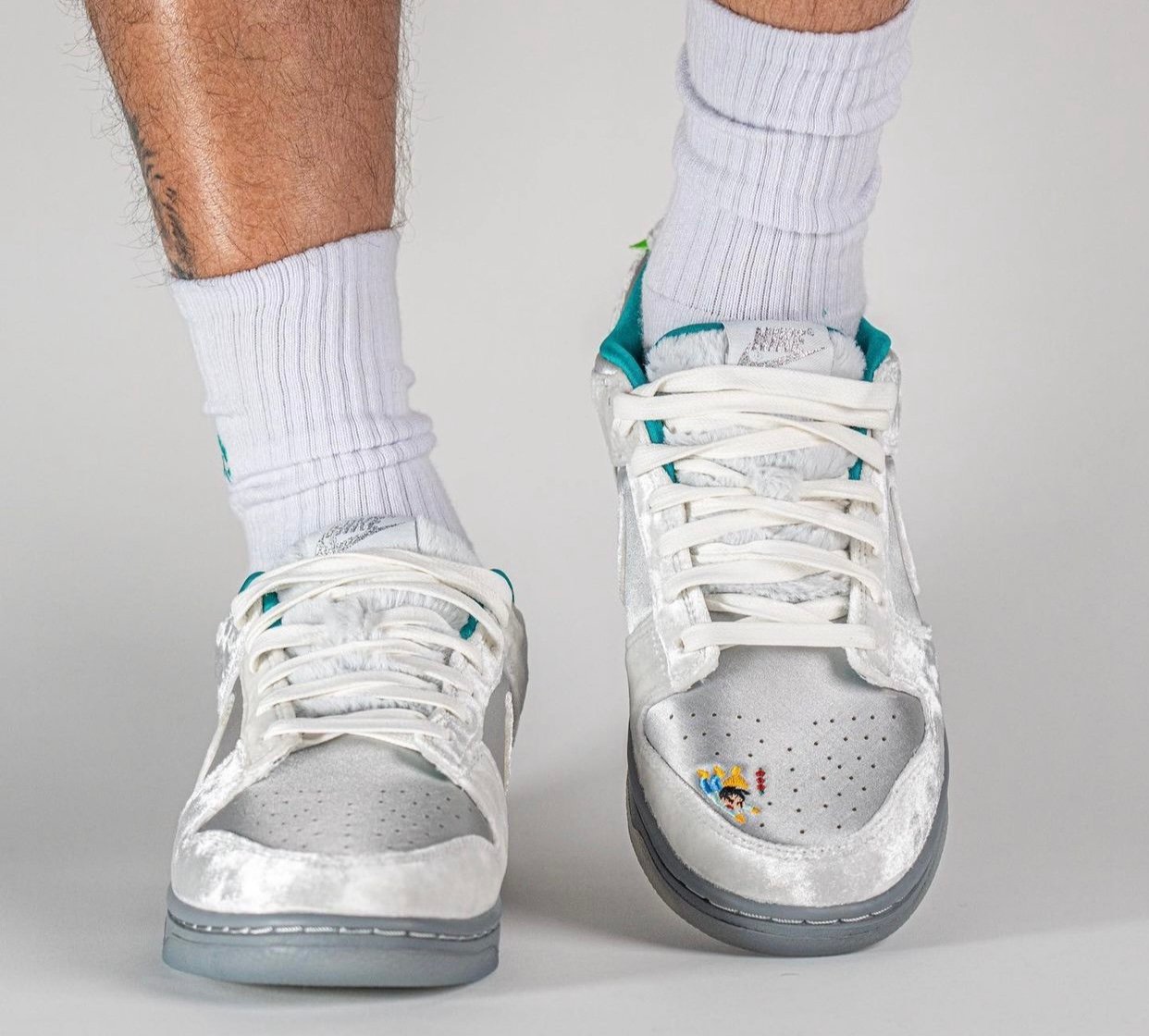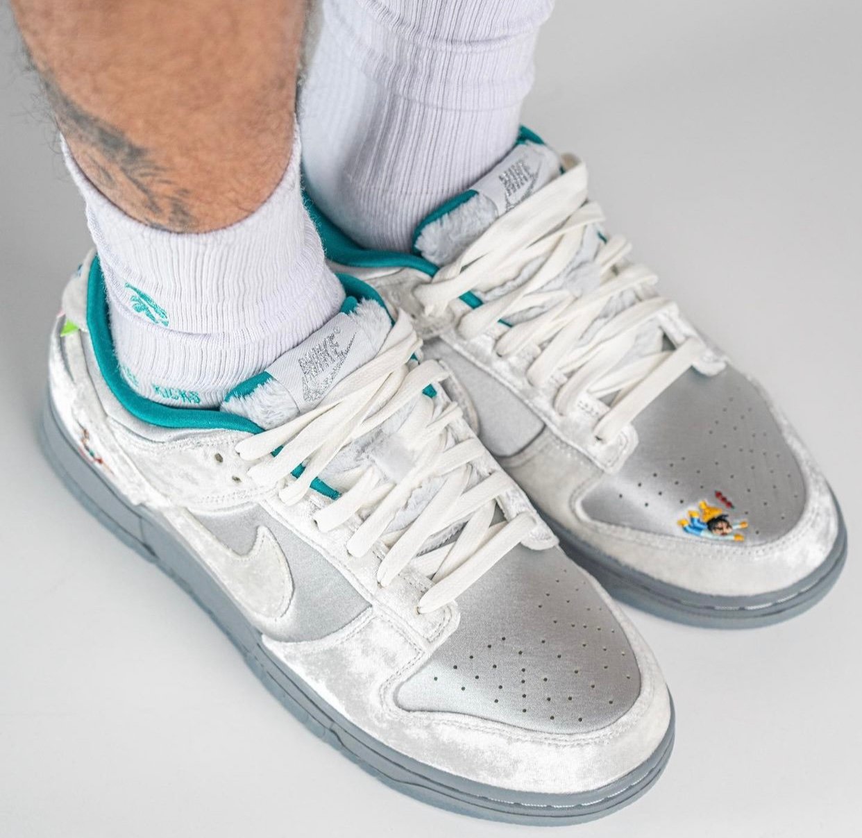 This Nike Dunk Low comes highlighted with Matte Silver on the base, while White velvet adorns the overlays. Adding pop, Teal covers the liner, and White fur covers the tongue. A splash of colors land on the heel that forms a pattern typically worn by medieval jokesters. Next, we have kids playing in the snow with a sled while a kanji lands on the insoles that translate to โIce.โ Lastly, we have a Grey midsole and a translucent outsole with snowflakes.