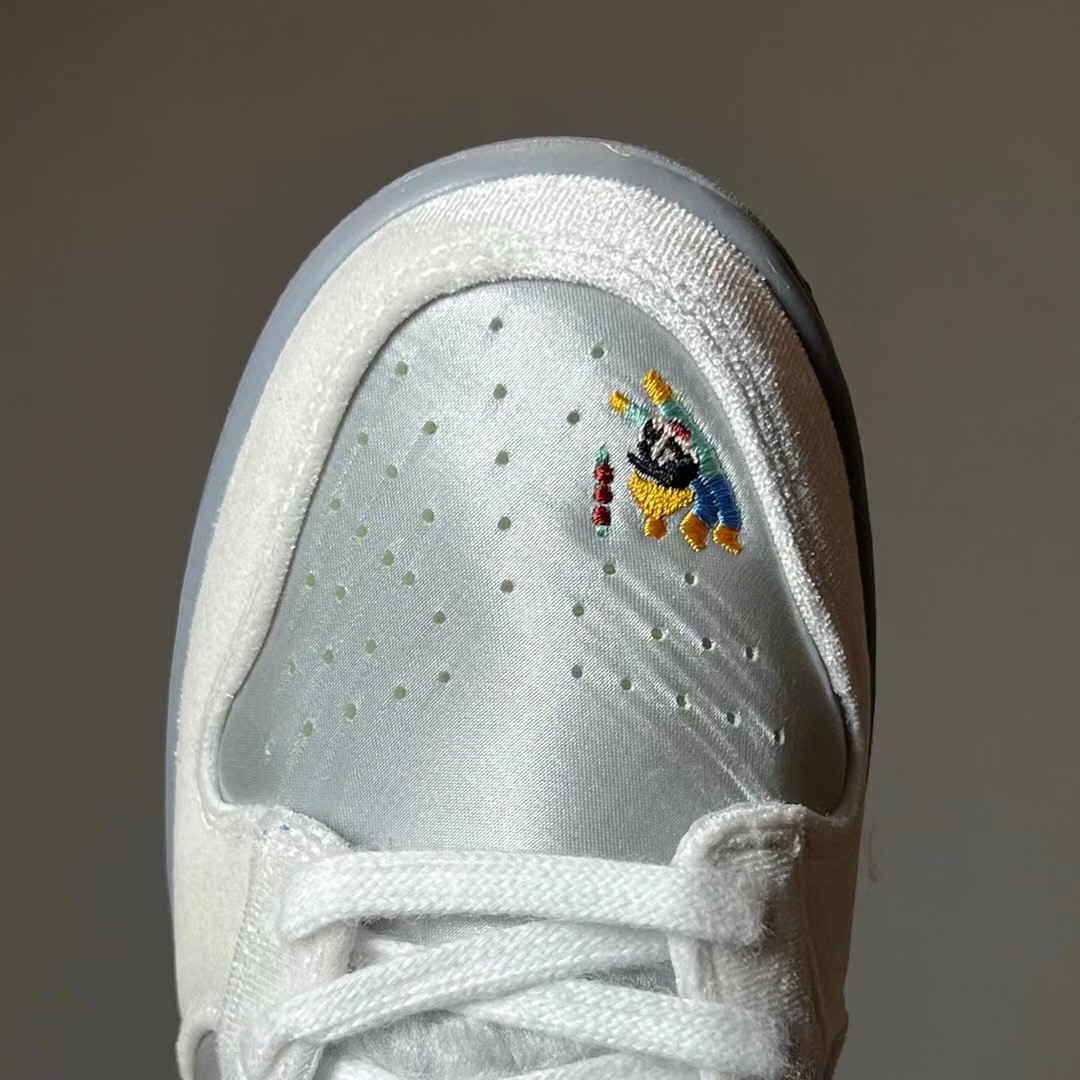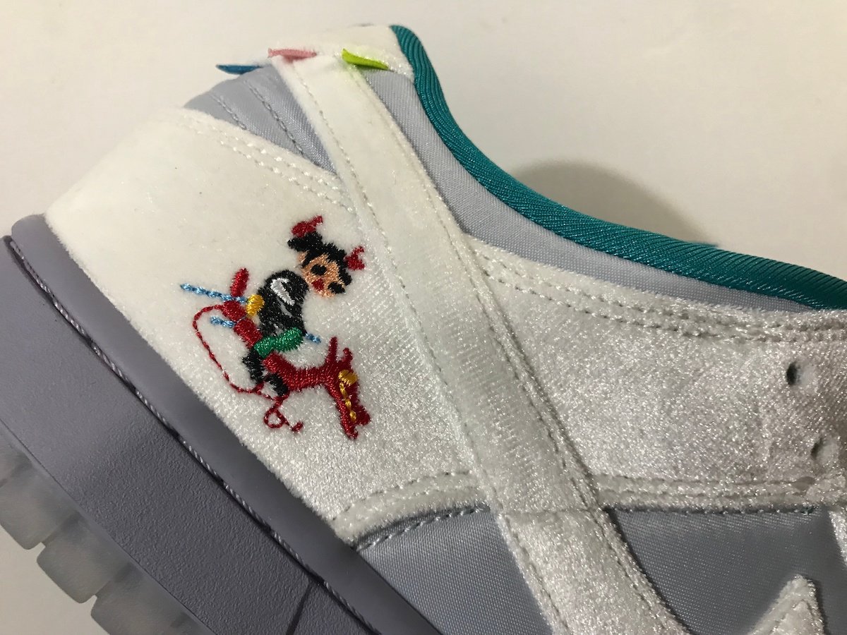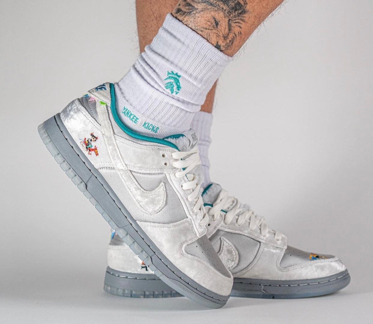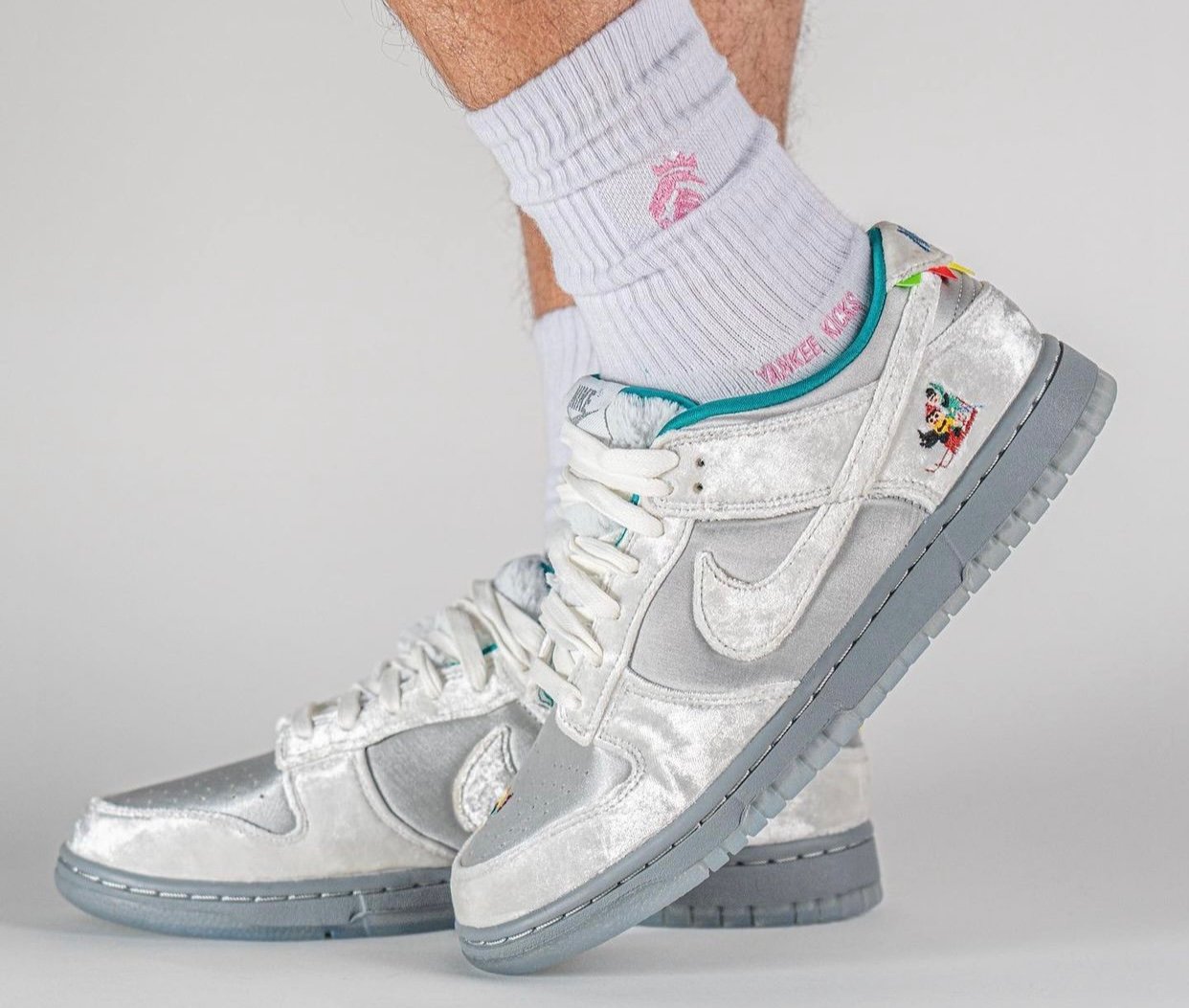 This Nike Dunk Low comes highlighted with Matte Silver on the base, while White velvet adorns the overlays. Adding pop, Teal covers the liner, and White fur covers the tongue. A splash of colors land on the heel that forms a pattern typically worn by medieval jokesters. Next, we have kids playing in the snow with a sled while a kanji lands on the insoles that translate to โIce.โ Lastly, we have a Grey midsole and a translucent outsole with snowflakes.
