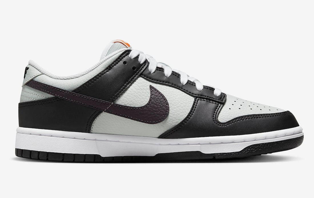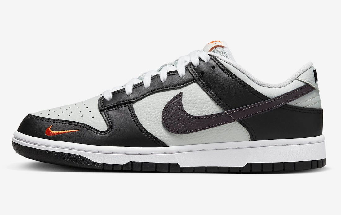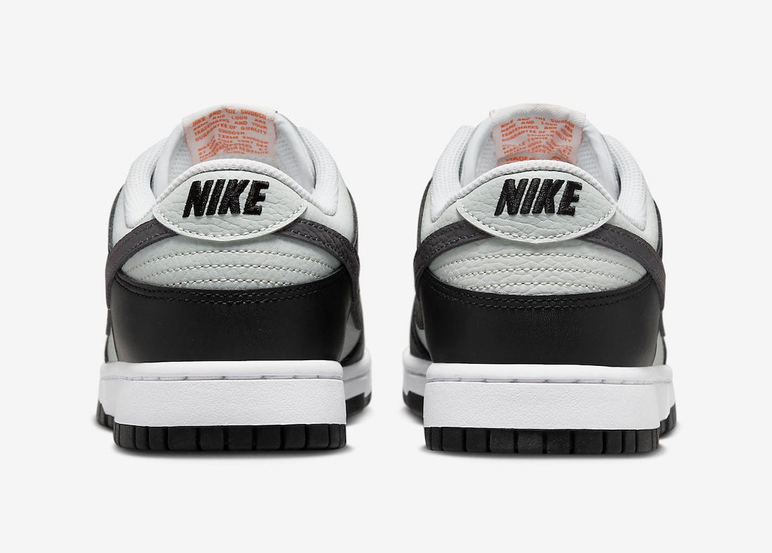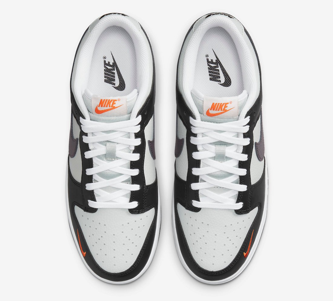 Looking closer, this Nike Dunk Low features Grey tumbled leather on the base that almost looks, White. The same treatment is given to the mesh tongue and liner. Next, smooth Black leather appears on the overlays and tumbled leather Swoosh logos on the panels, giving the shoes the โPandaโ treatment. Standing out from other drops, we have Orange mini Swoosh logos on the lateral forefoot, filling in the tongue branding. More Black hits the insole branding embroidered Nike on the heels and rubber outsole. Finishing the look is White on the laces and midsole.