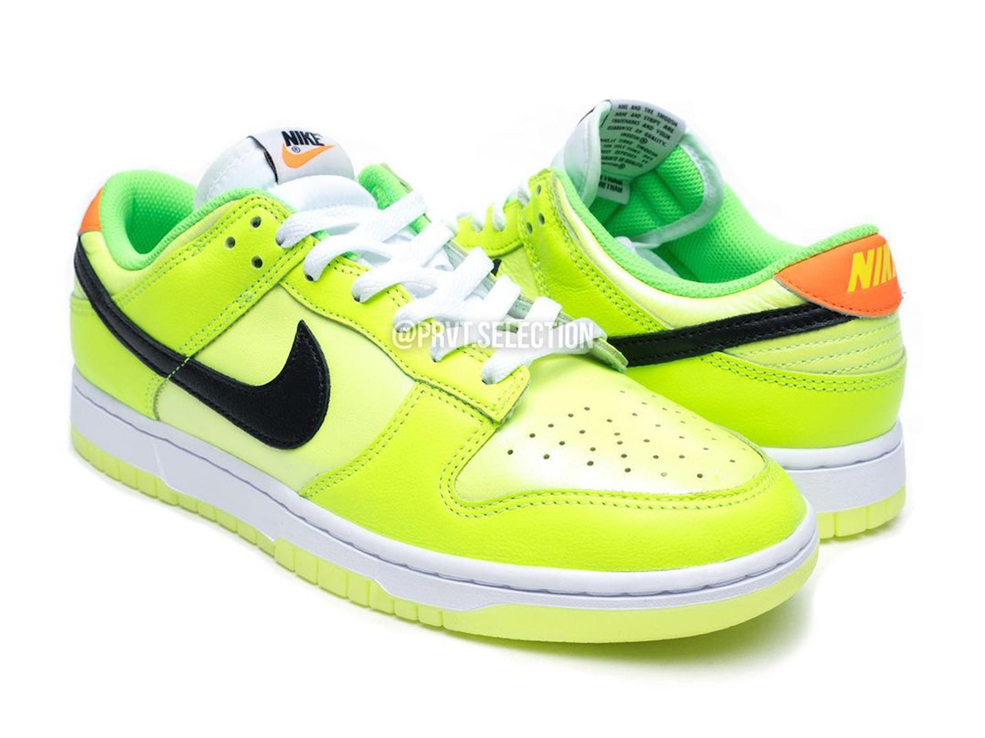 Going over this Nike Dunk Low, the shoes feature Volt across the upper while constructed with a shiny finish on the base and leather overlays. Next, Black covers the Swoosh logos with White on the tongue, laces, and midsole. Orange appears on the heel tab, and tongue branding and Volt drapes the liner. Highlighting this pair is glow-in-the-dark details on the upper and outsole.