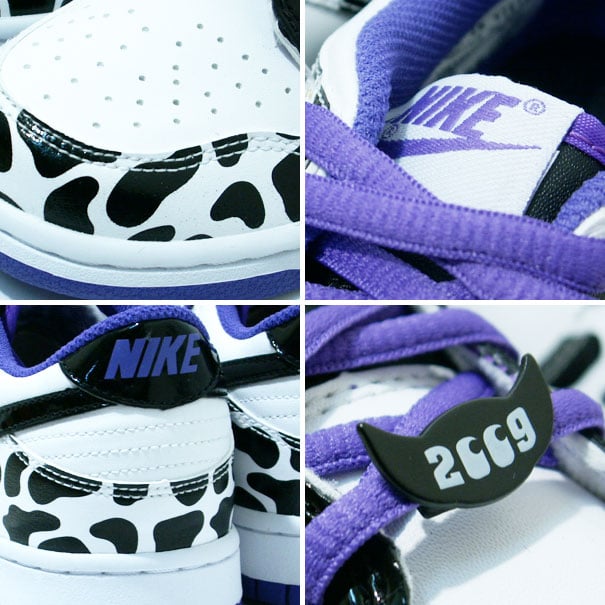 Are you looking for something in a small size that is extremely unique? Do you have an obsession with cows or cattle? If you answered, “Yes,” to either of those questions, we have the right sneaker for you. This pair of Nike Dunk Lows will be released in gradeschool sizes during the Spring of 2009. The most obvious and eye-catching feature of this Nike sneaker is the cow print patternย seen on the sidepanels and mudguard. Another key aspect of this pair is the use of the color purple to accent the white and black base. The aforementioned toneย seems to be a representative of the logo of Cadbury, a world renowned chocolate milkย producer. Lastly, this pair includes black lace locks with “2009” written on them in the shape of a bull’s horns. Though not officially released yet, you can scoop up your pair at Atmos.