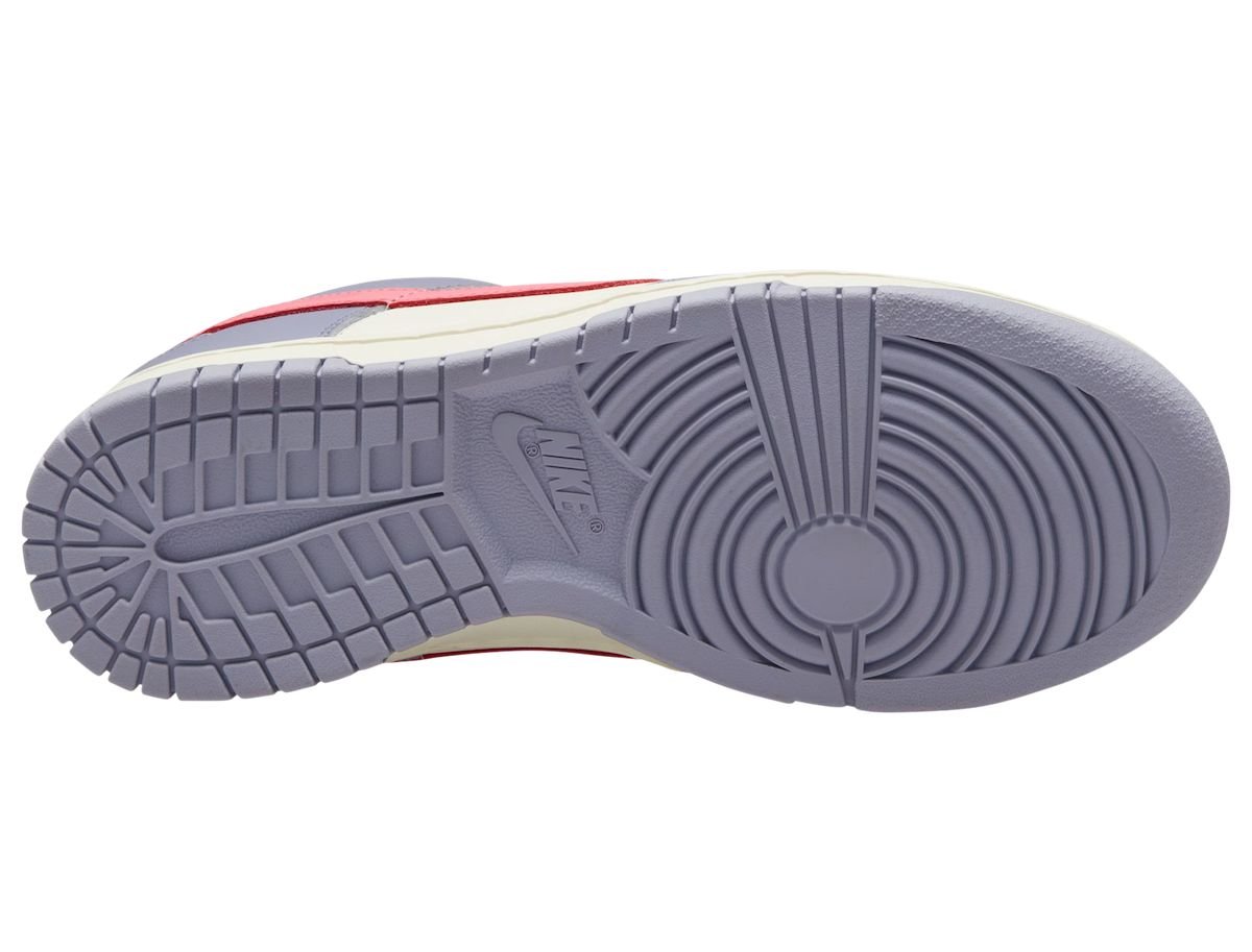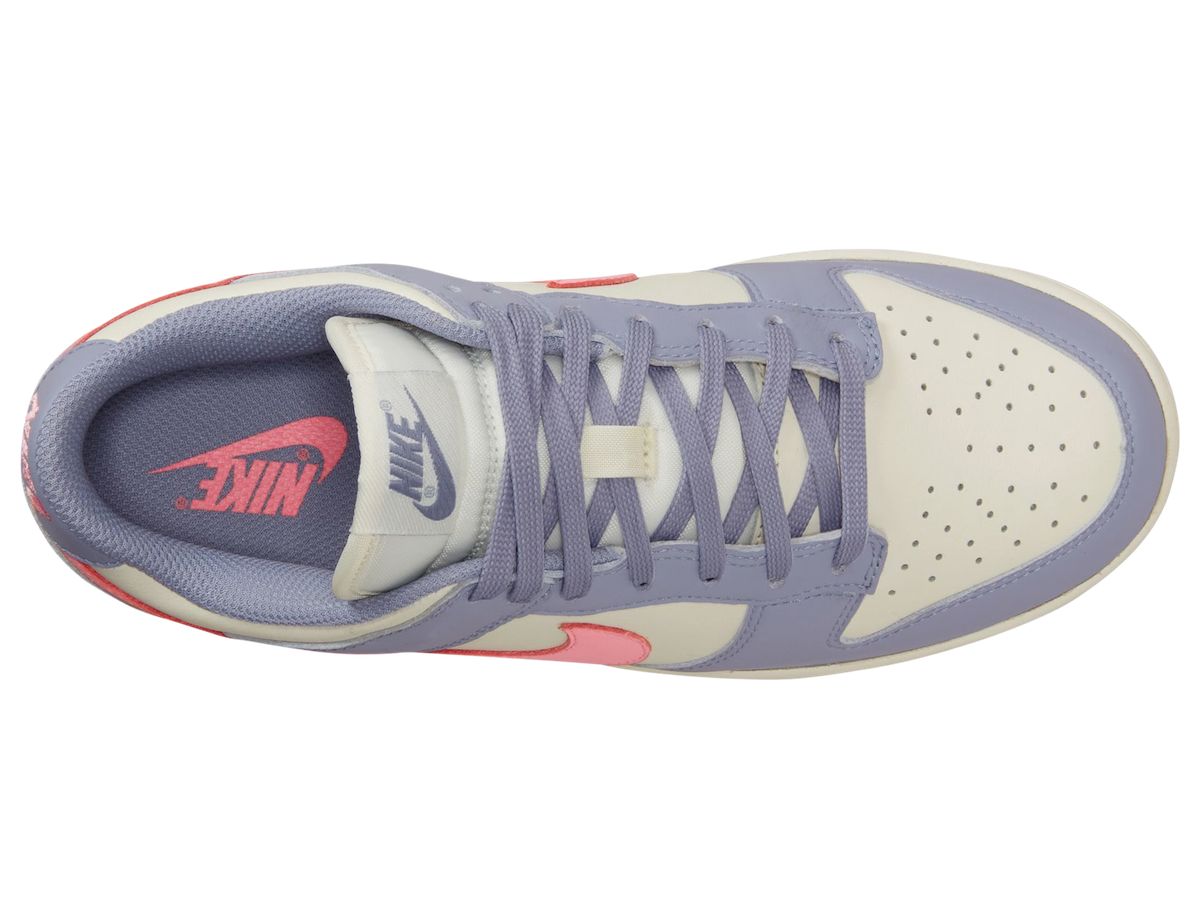 This Nike Dunk Low features an Indigo Haze, Coral Chalk, and Sail color combination. Looking closer, the pair has Sail on the base while Indigo adorns the overlays. Constructed with leather and a mesh tongue, Coral fills in the Swoosh logo and Nike branding on the heel. Other details include a Sail midsole and a Purple rubber outsole.