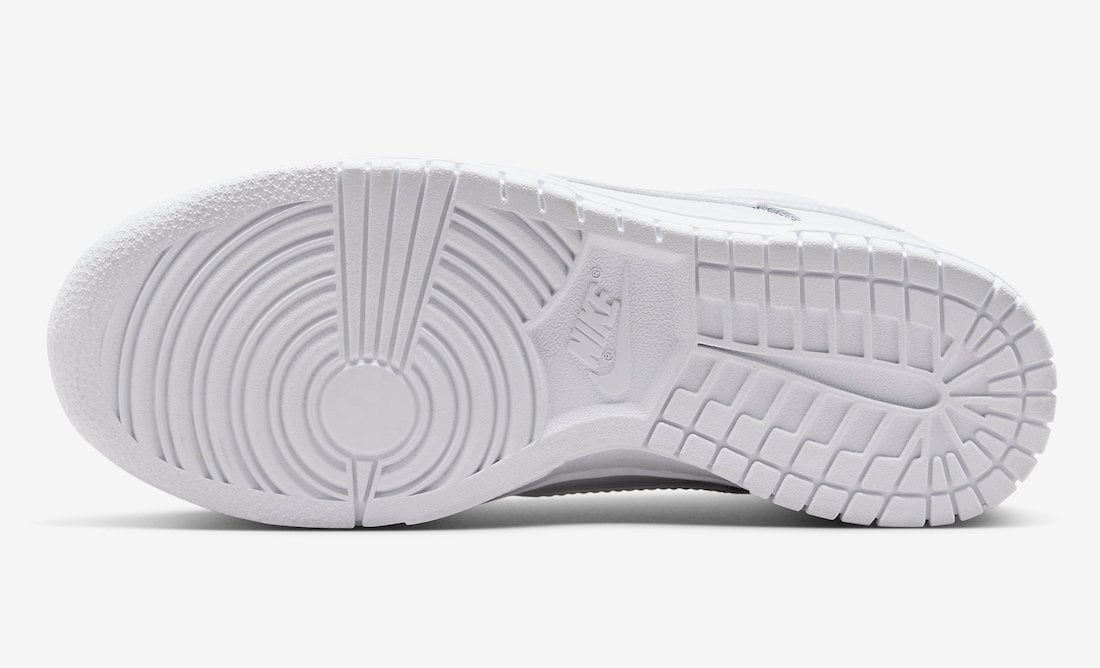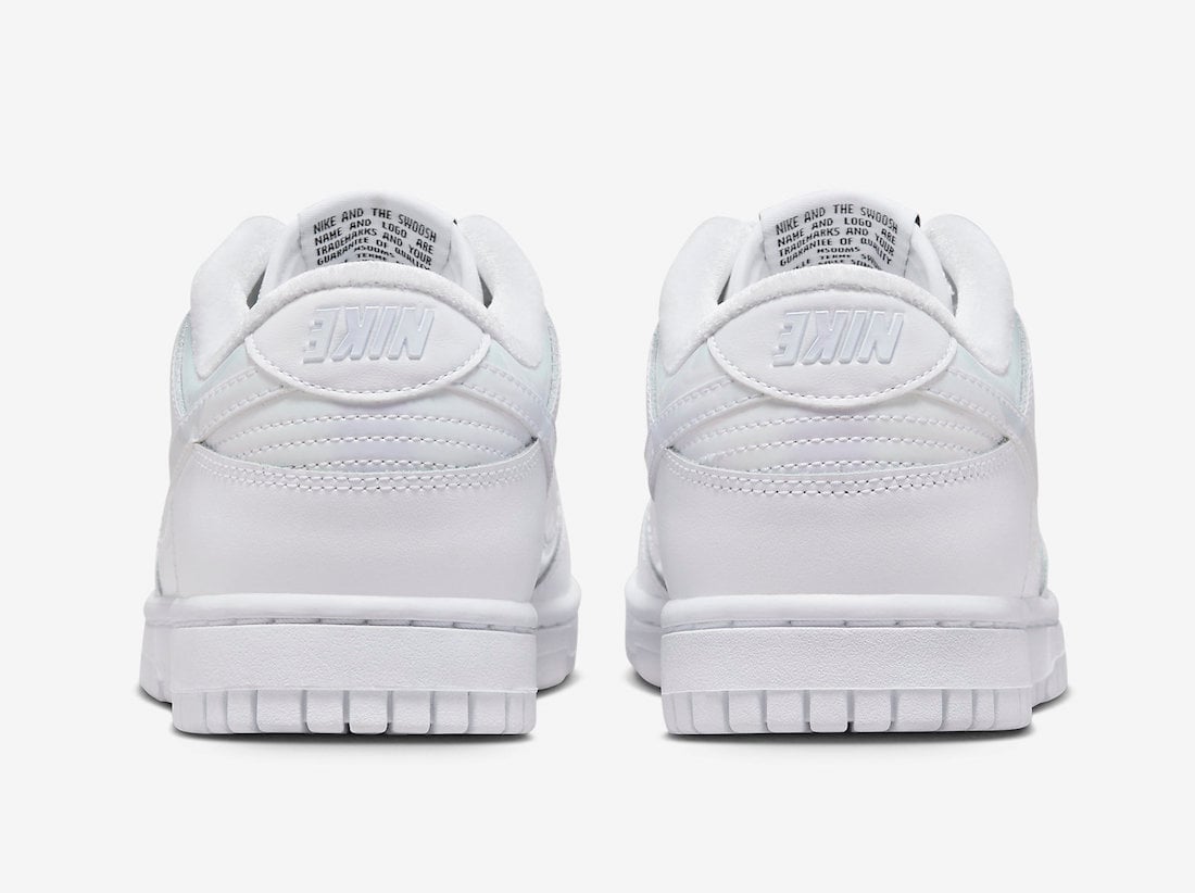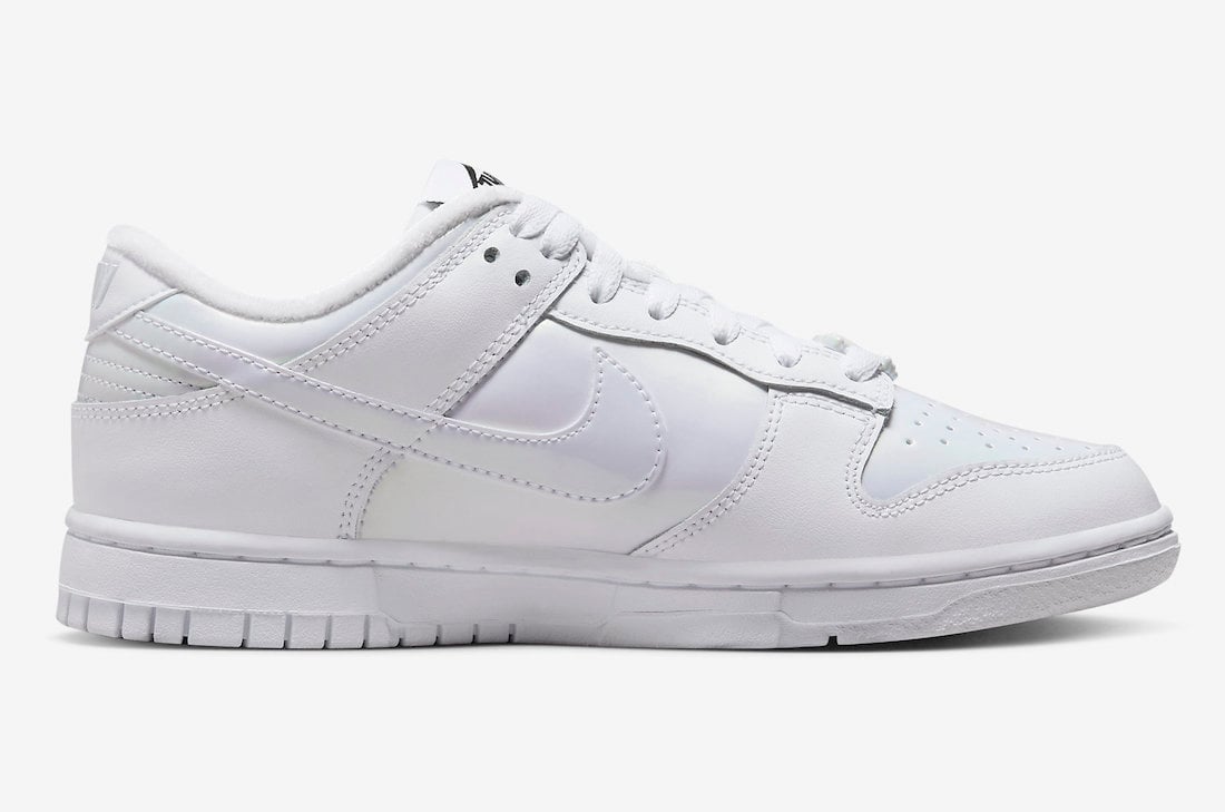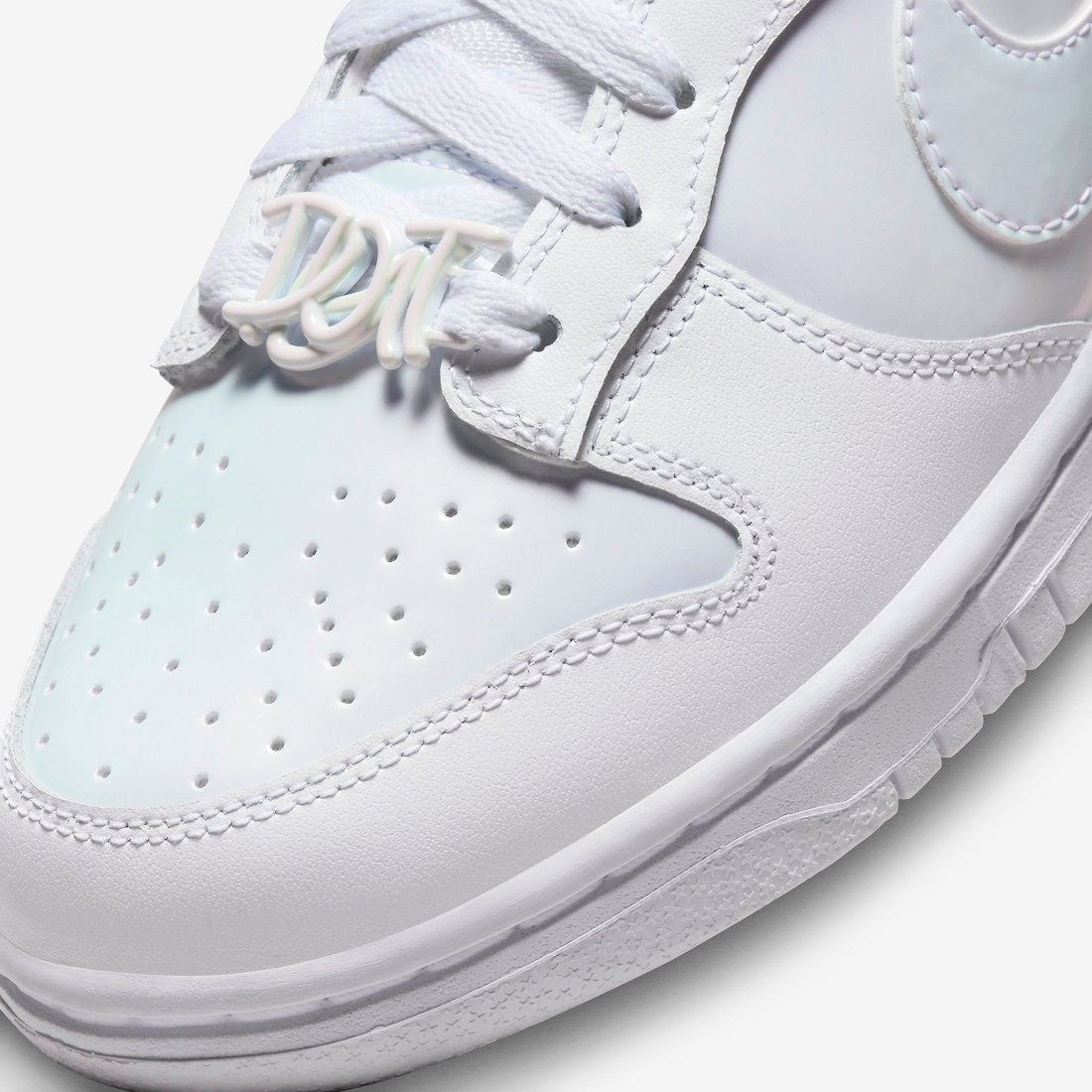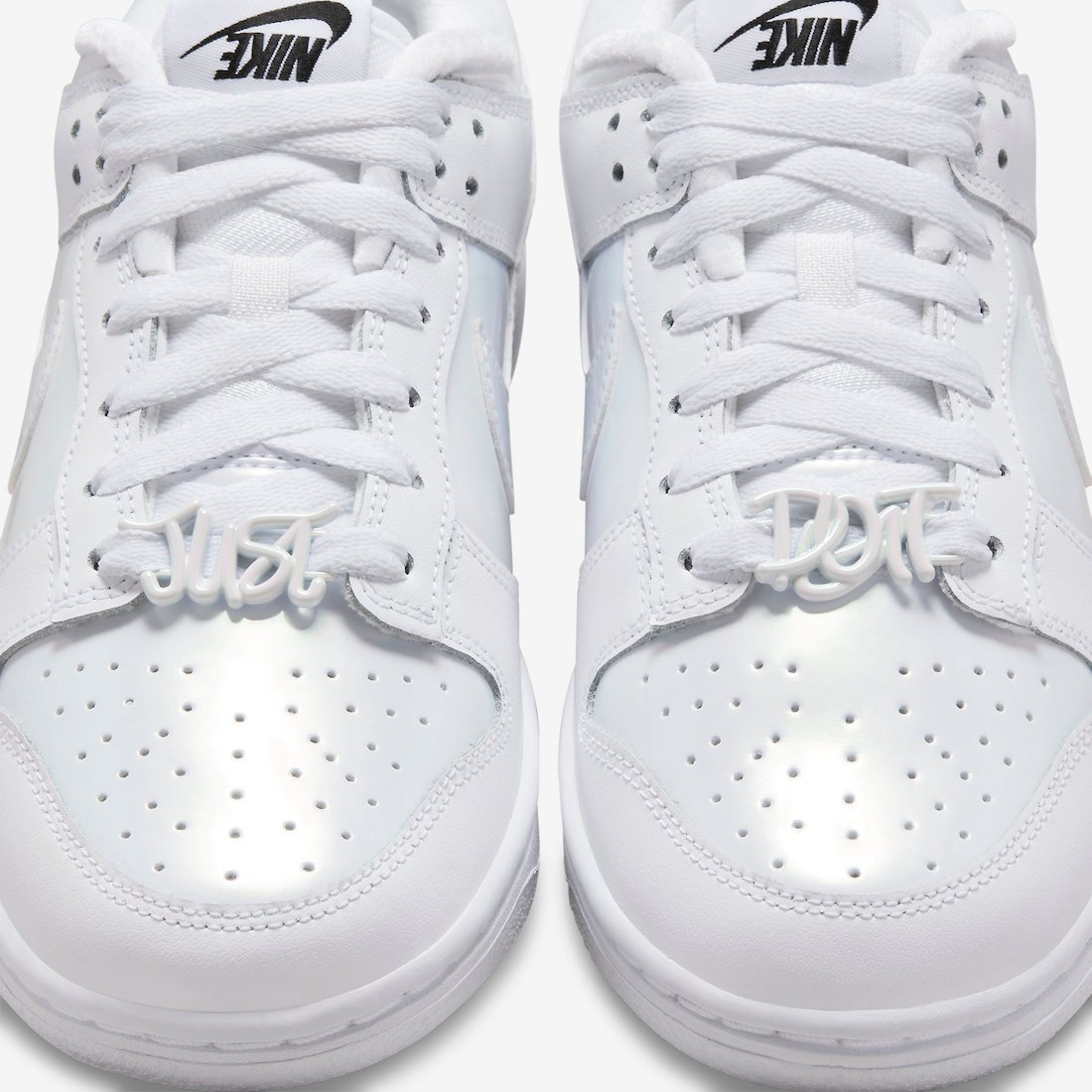 When first glancing at this Nike Dunk Low, it appears that it comes in all-White, which leans towards the plain side. However, if you look closely, youโll notice iridescent detailing on the toe box, panels, Swoosh logos, and heels. In addition, we have upside down logos on the tongue labels and insoles in Black, with โNIKEโ written on the heels upside down and backwards. Other details include โJust Do Itโ lace dubraes and a solid White rubber sole.