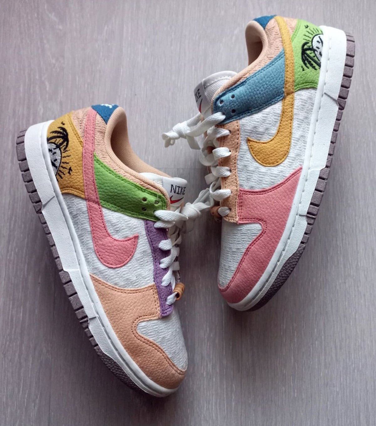 This eye-catching Nike Dunk Low will release in womenโs sizing and features a woven base while leather adorns the overlays. Various shades run throughout like Peach, Purple, Green, Yellow, and Blue but the real highlight is the rising sun insignia with a smiley Swoosh by the heel. Finishing the look, White runs across the midsole and we have a Grind rubber outsole.