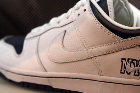 The person who iD this pair choose the NYC stitched with the Nike logo running through it, a nice change. To finish off the Nike Dunk Low New York Yankees, they contain a perforated mid panel. Available in limited quantities at the House of Hoops.