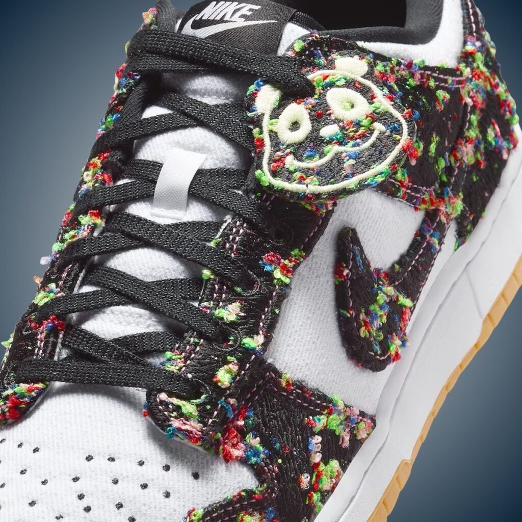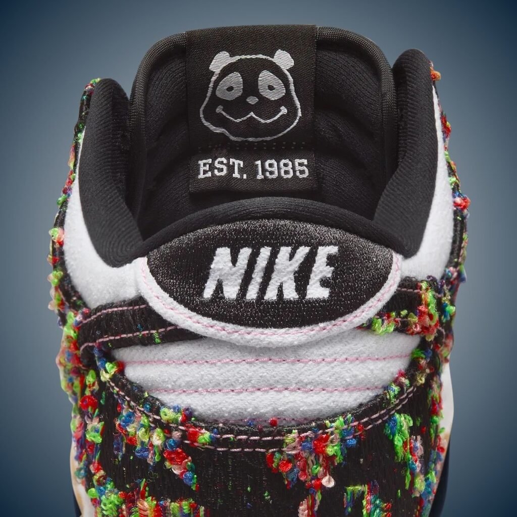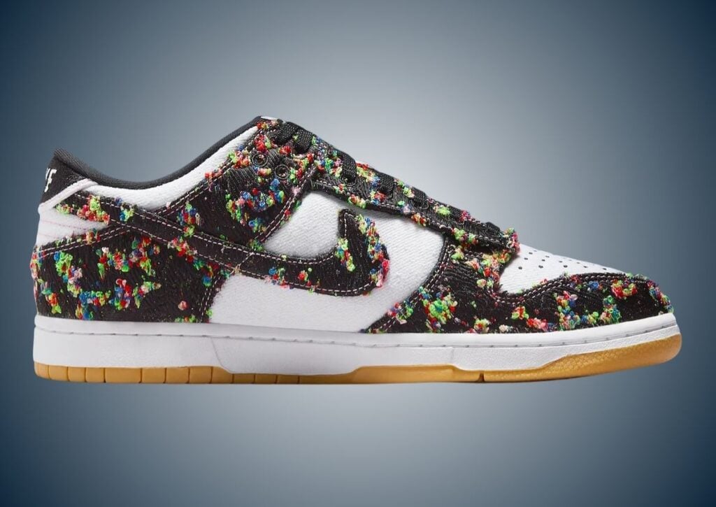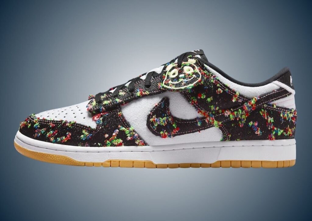 Dressed in a White, Black, and Gum Yellow color combination. Looking closer, this Nike Dunk Low features a White canvas base. In addition, Black appears on the overlays that are textured with bouclรฉ yarn, resembling confetti. A panda face is attached to the laces and inside of the tongue with โEST. 1985.โ You will also notice Pink subtle stitching throughout and โNIKEโ on the heels. Other details include a White midsole and a Gum rubber outsole.