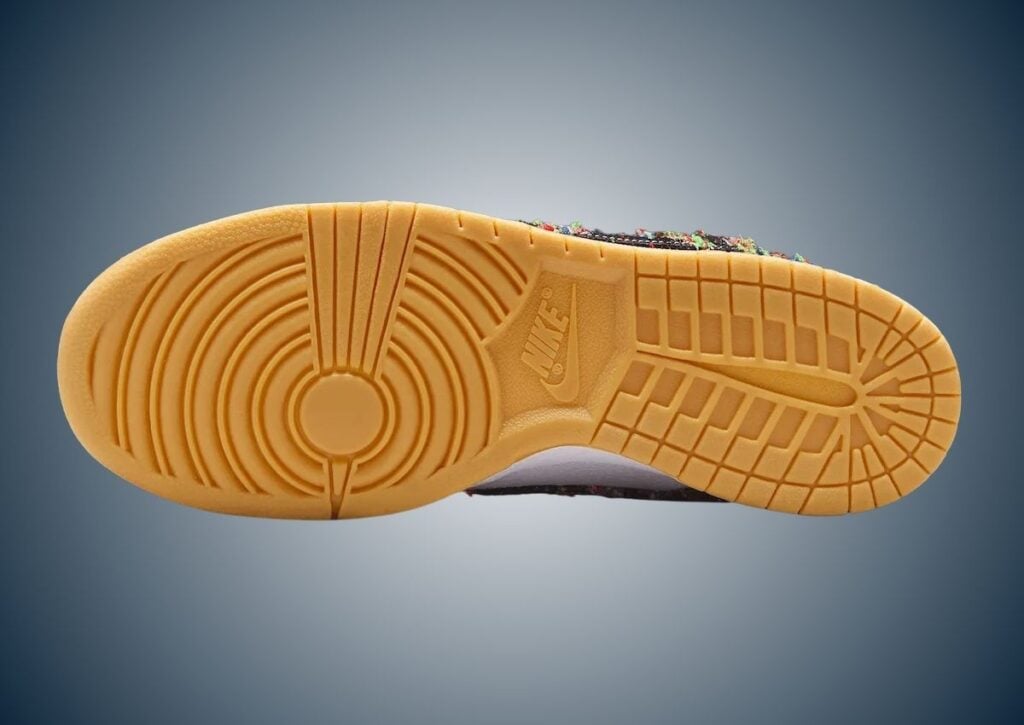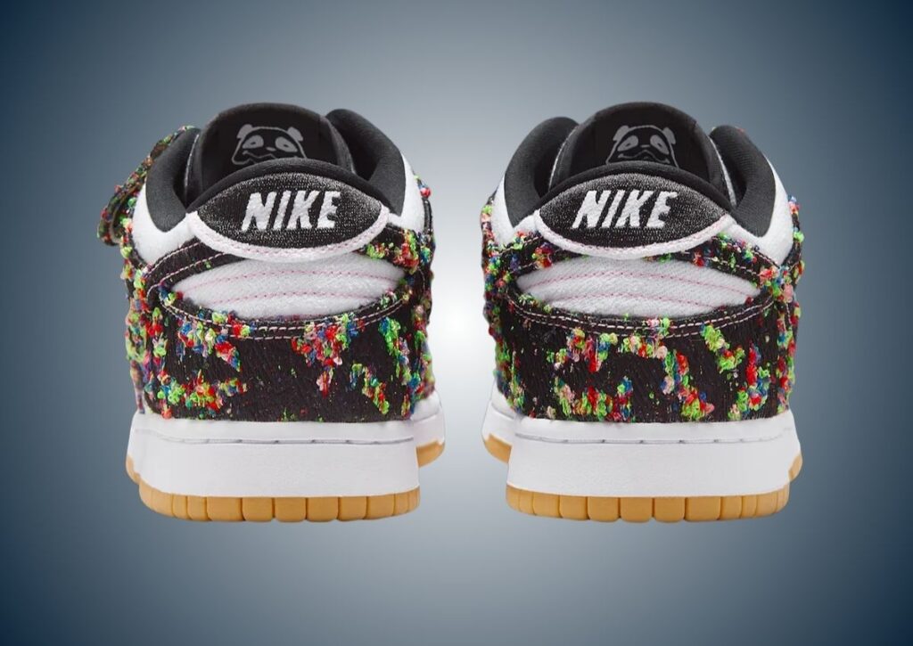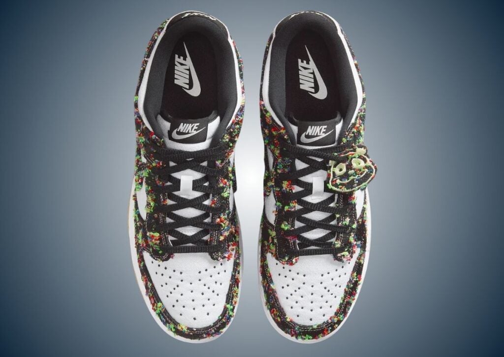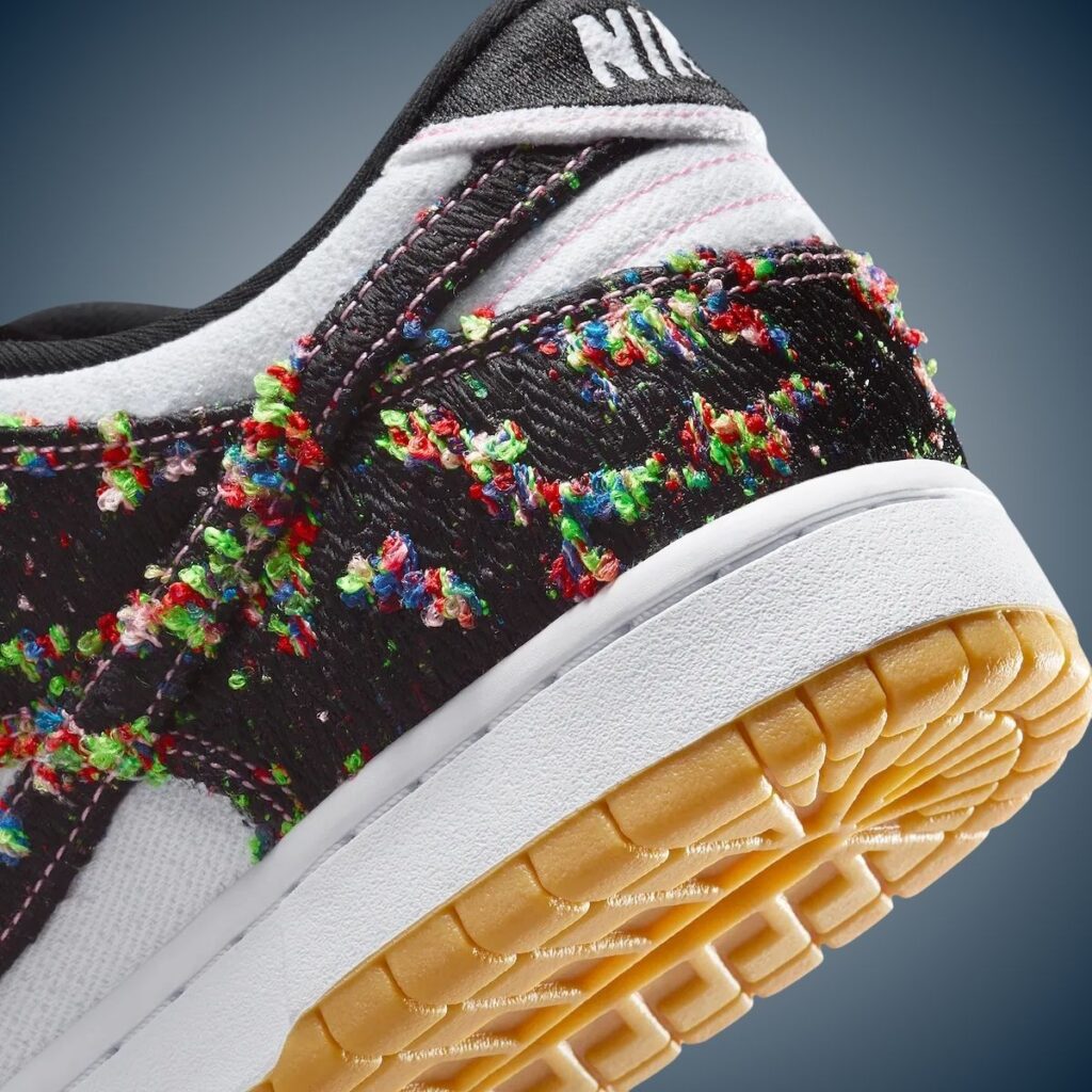 Dressed in a White, Black, and Gum Yellow color combination. Looking closer, this Nike Dunk Low features a White canvas base. In addition, Black appears on the overlays that are textured with bouclรฉ yarn, resembling confetti. A panda face is attached to the laces and inside of the tongue with โEST. 1985.โ You will also notice Pink subtle stitching throughout and โNIKEโ on the heels. Other details include a White midsole and a Gum rubber outsole.