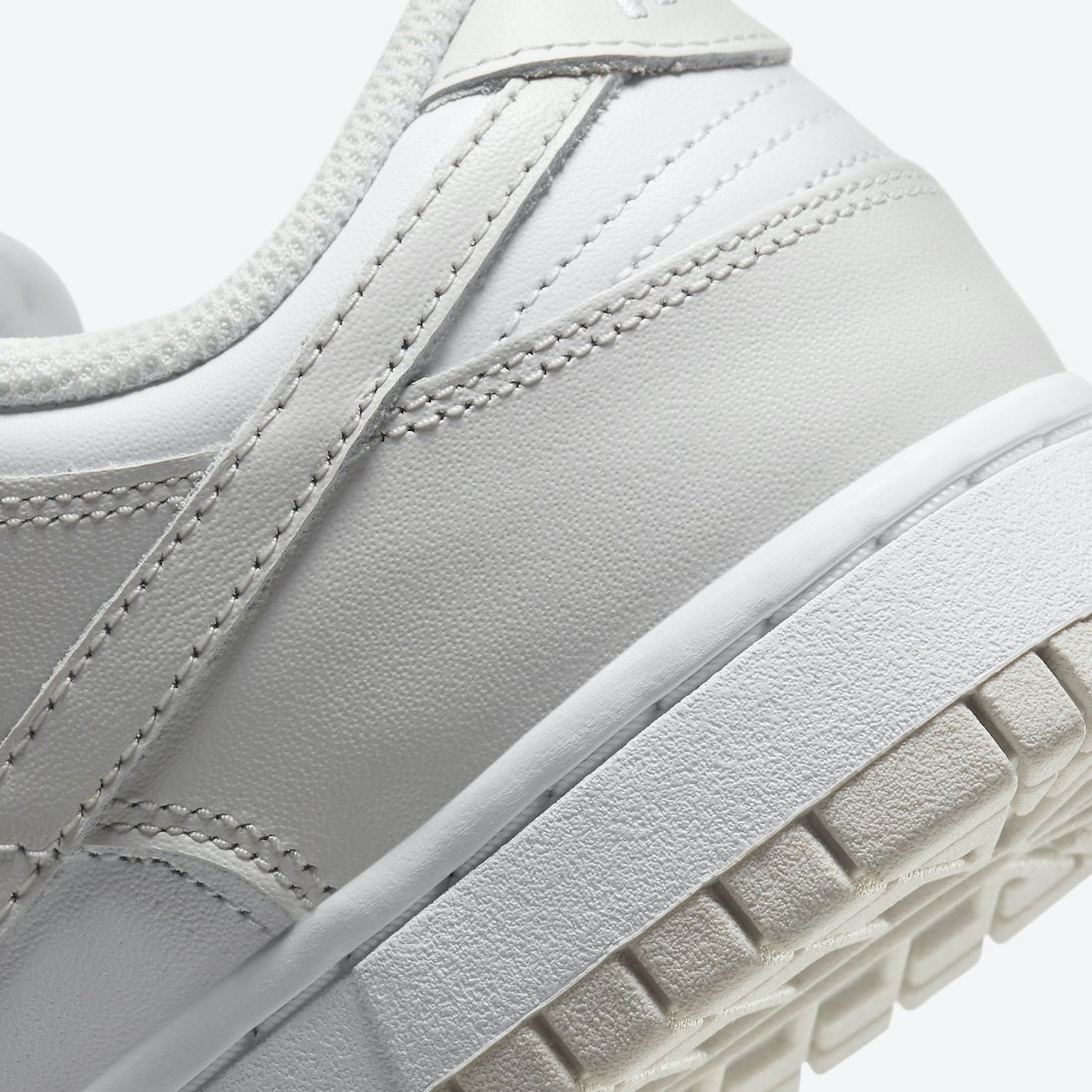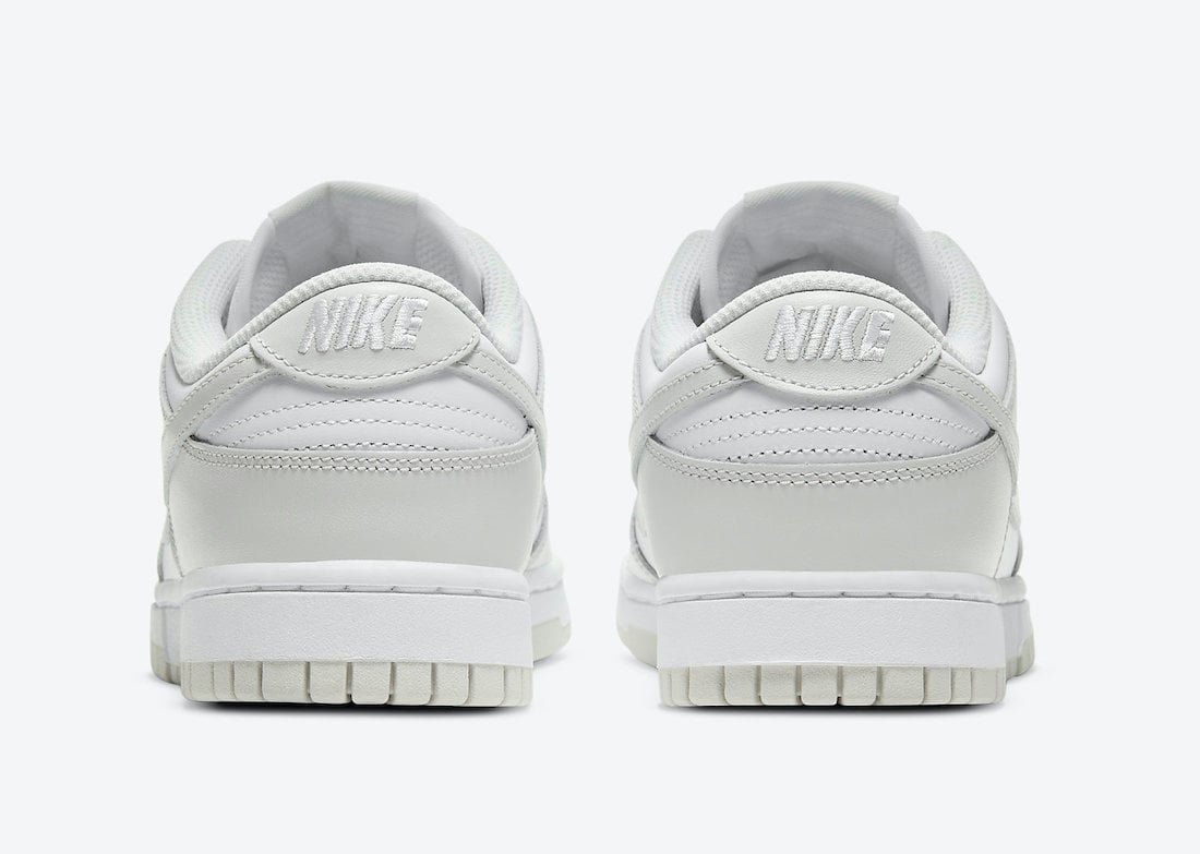 This Nike Dunk Low comes dressed in a White and Photon Dust color combination. First, we have White leather across the base which lands on the panels and the perforated toe. Next, a light shade of Grey adorns the overlays on the Swoosh, heel, eyestay, and rubber outsole. Finally, a White midsole and Black branding on the insoles finish the look.